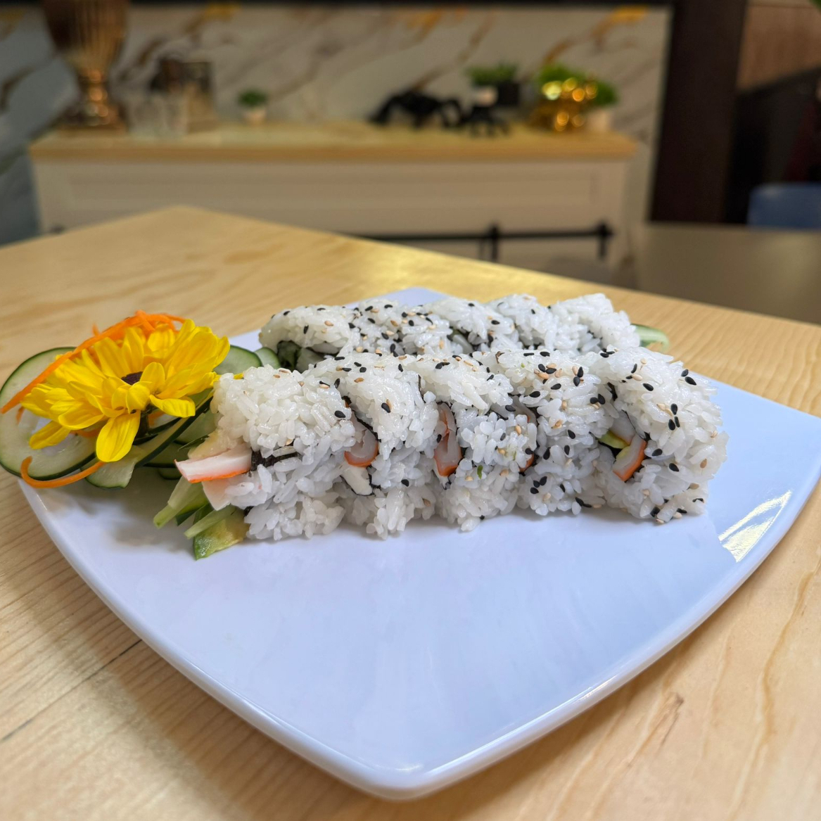mitad rollo california mas teriyaki de pollo en una base de arroz blanco y salsa de la casa.
