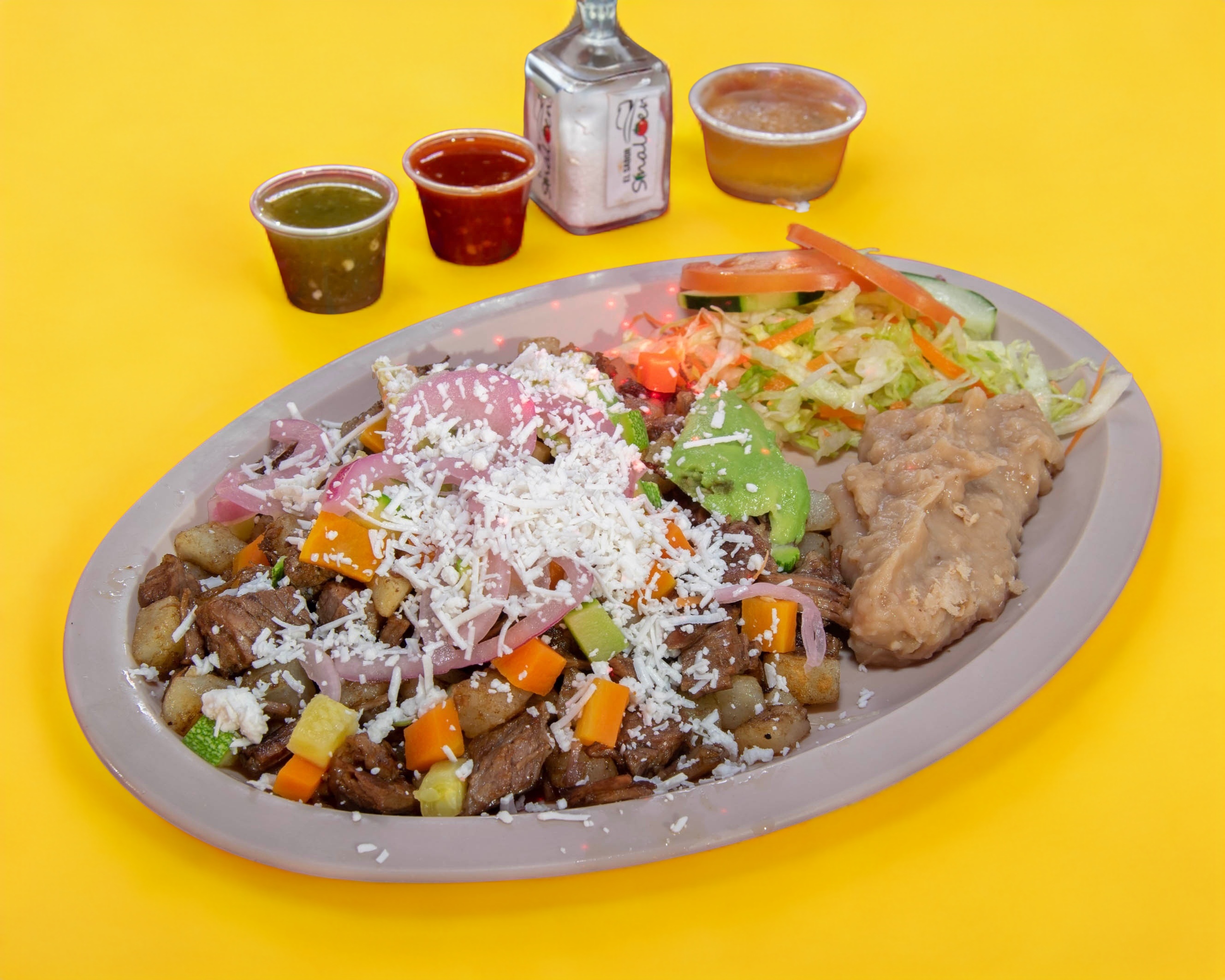 Cubos de carne de res y papas fritas, servido con zanahoria, calabaza, cebolla curtida y queso, acompañados de ensalada, frojoles y consome de res.