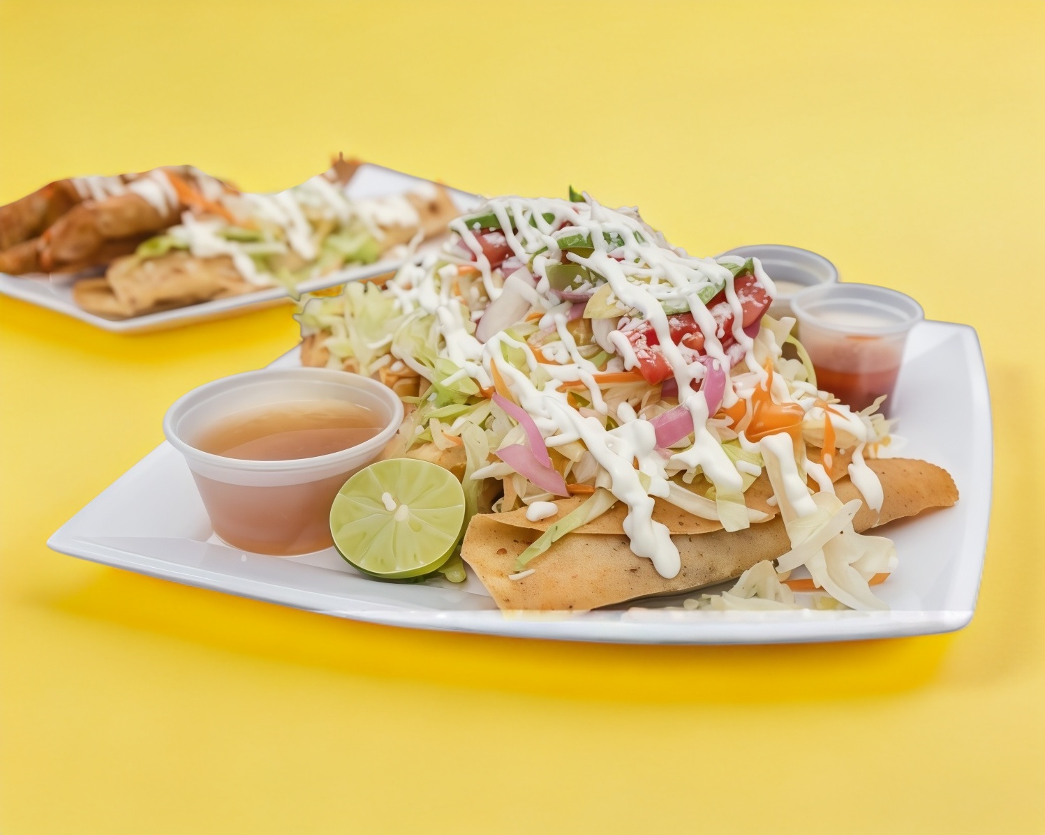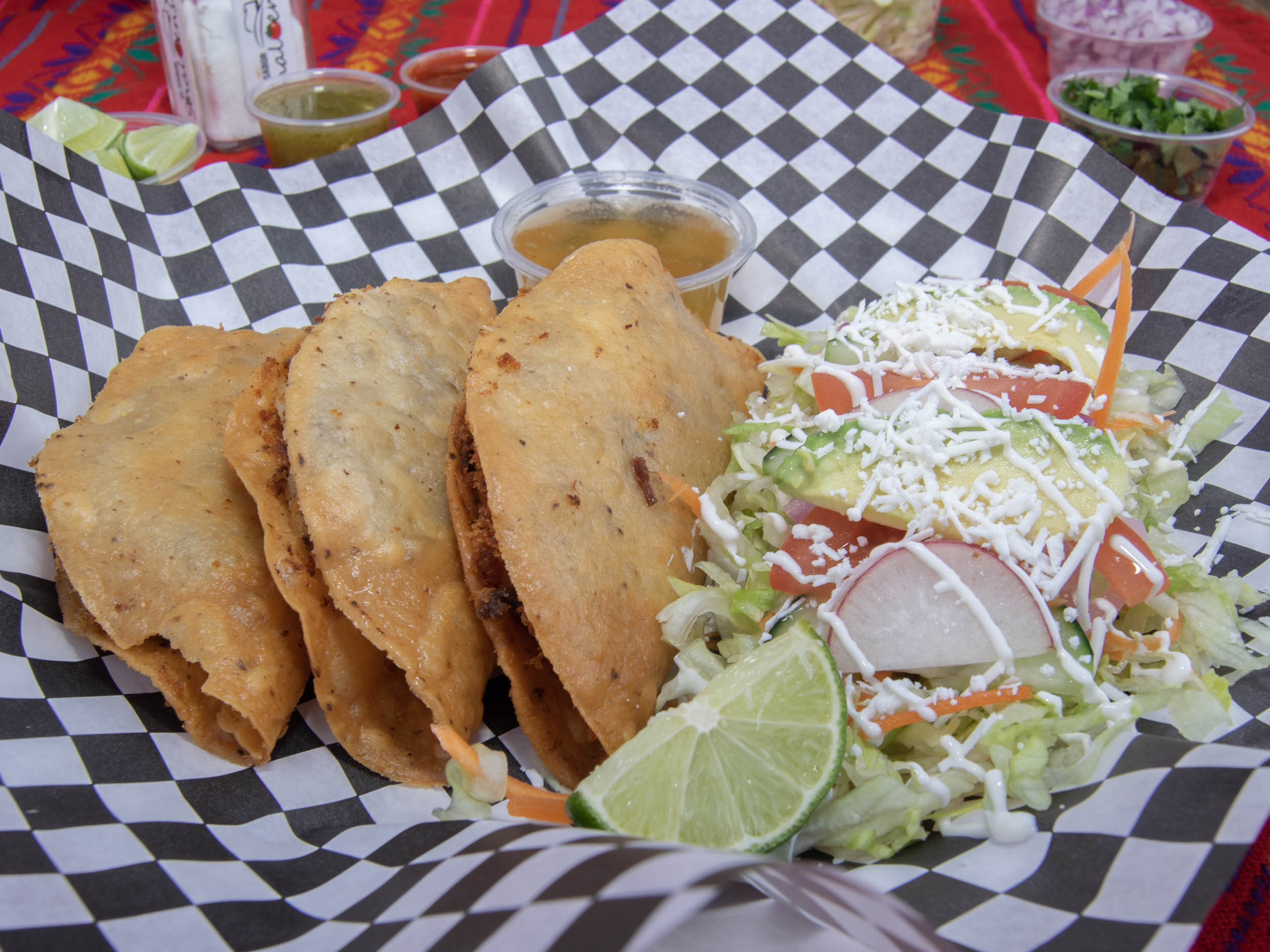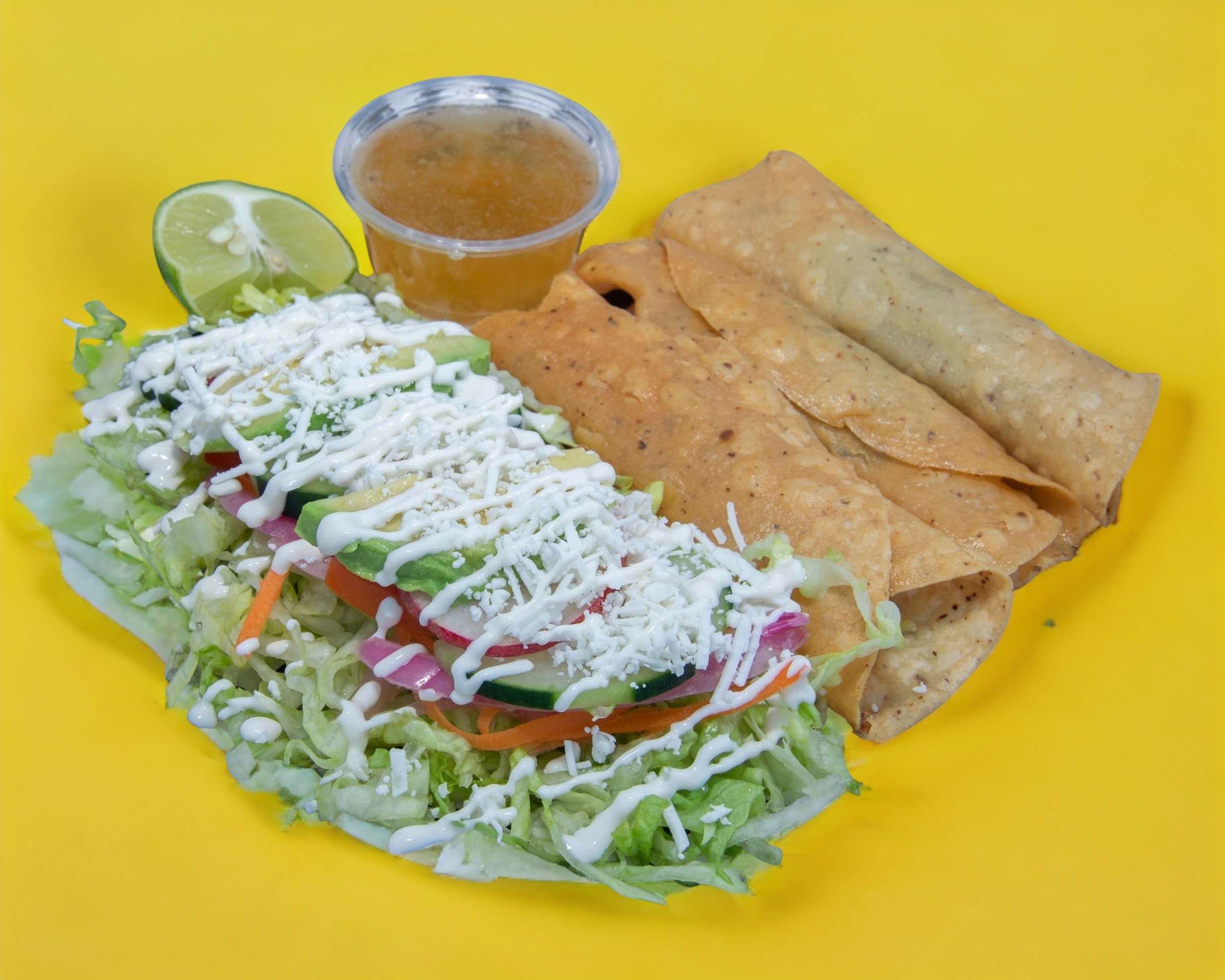 Servidos con lechuga, cebolla, curtida, tomate, pepino, rábano, aguacate, queso y crema, acompañados de consomé de res.