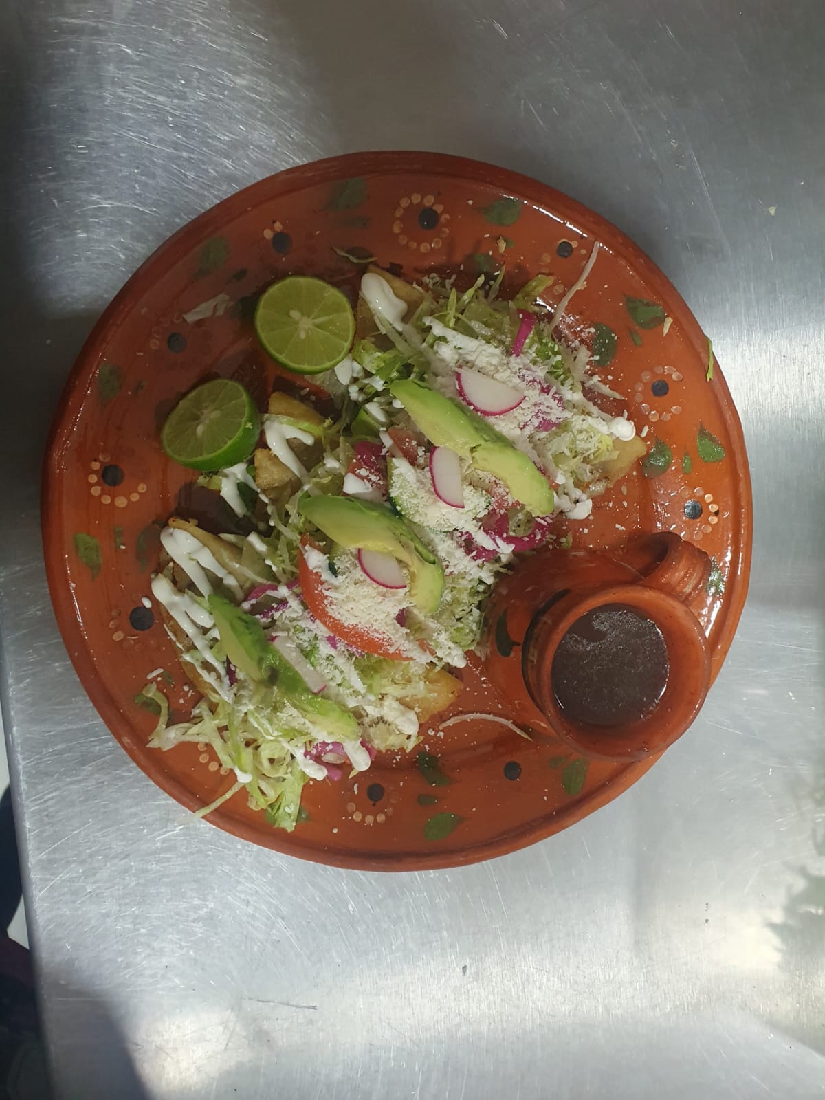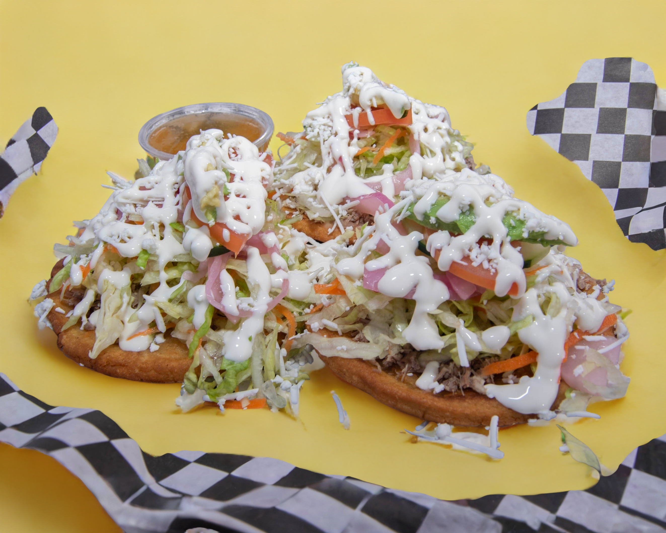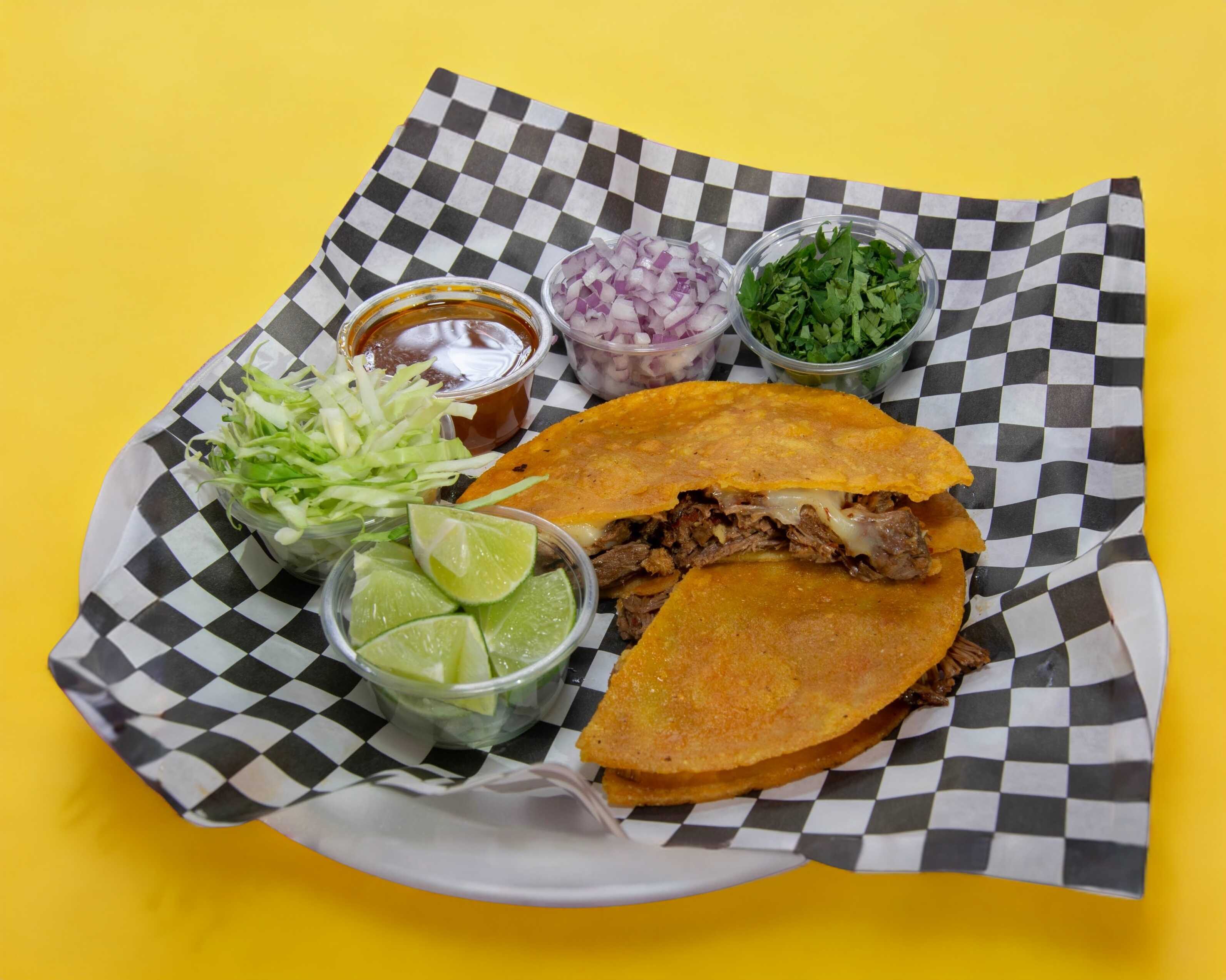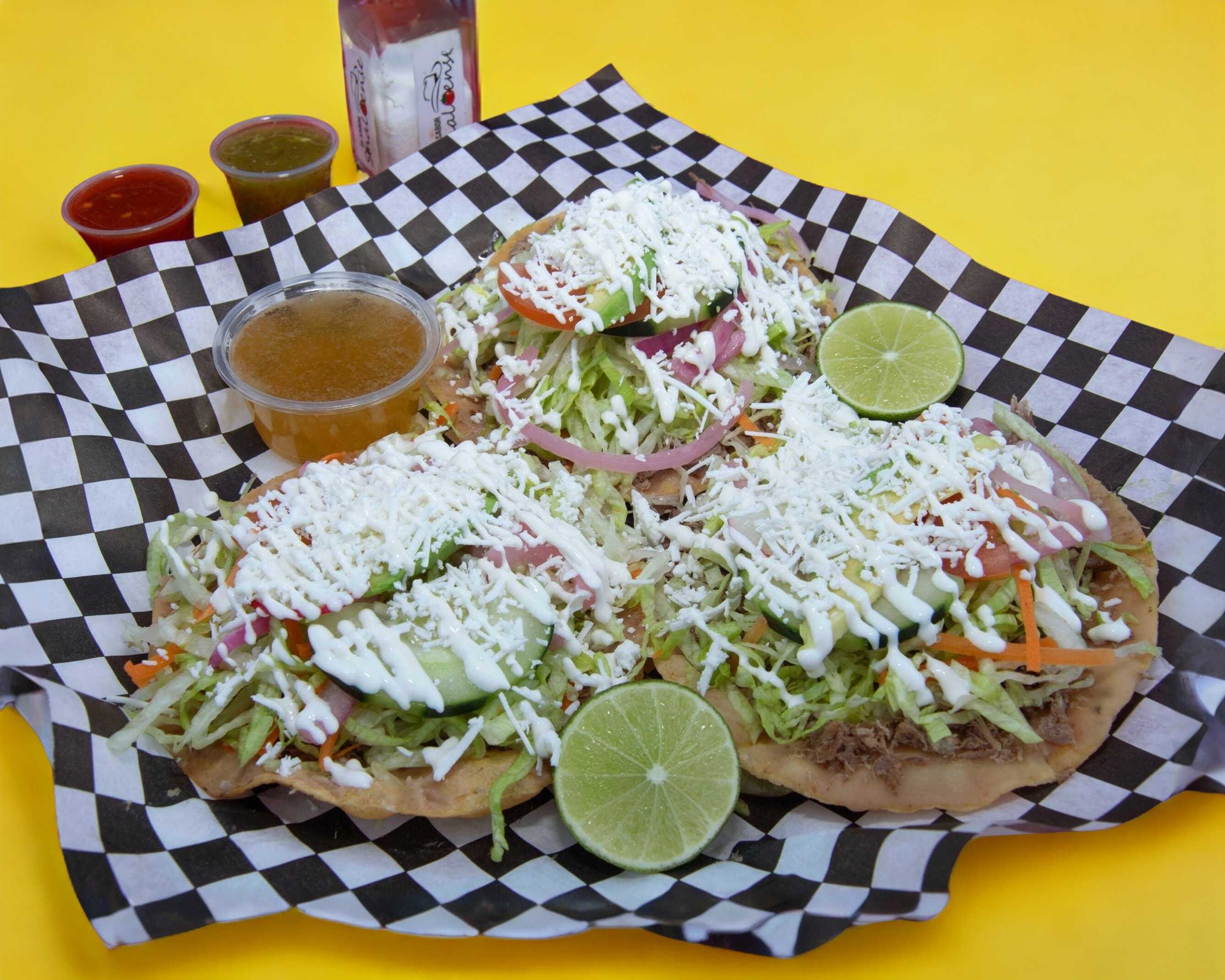 Servidas con lechuga, cebolla, curtida, tomate, pepino, rábano, aguacate, queso y crema, acompañados de consomé de res.