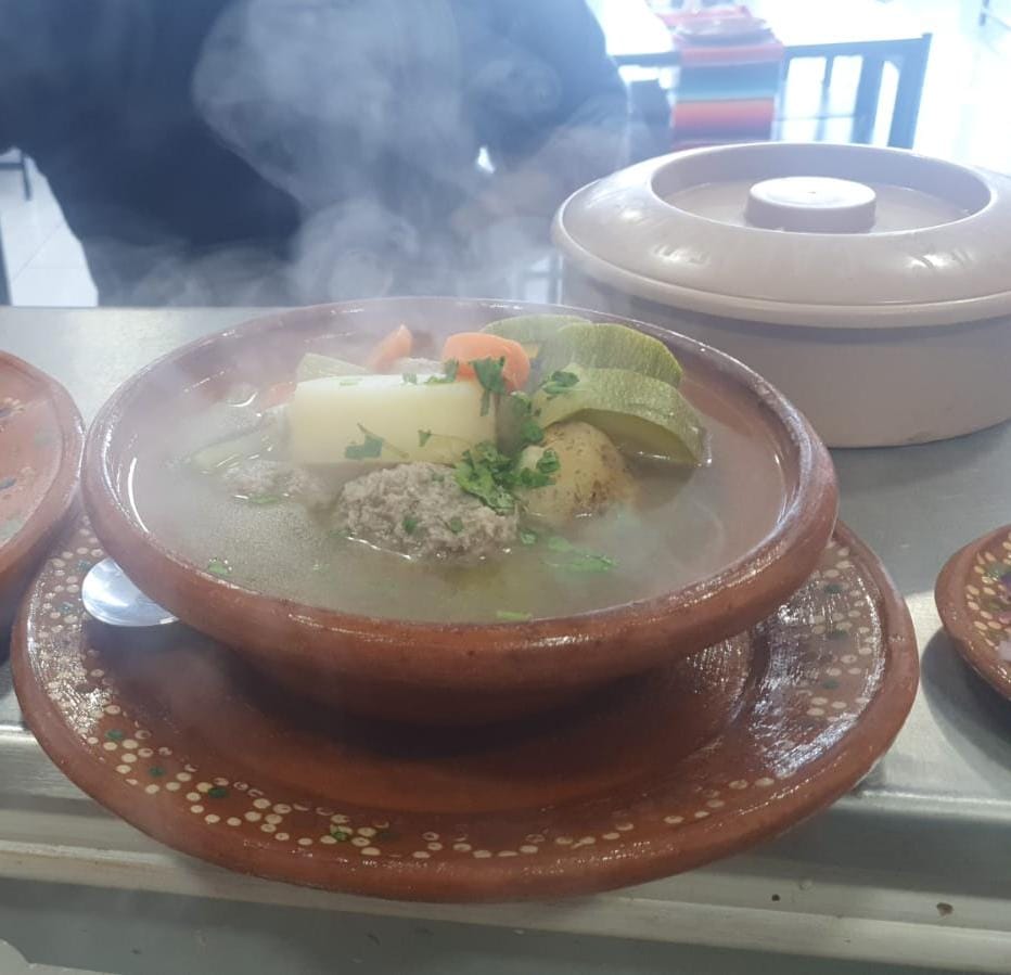 Caldo de Albondigas con papa, zanahoria, calabaza y apio, acompañado de arroz rojo y tortillas