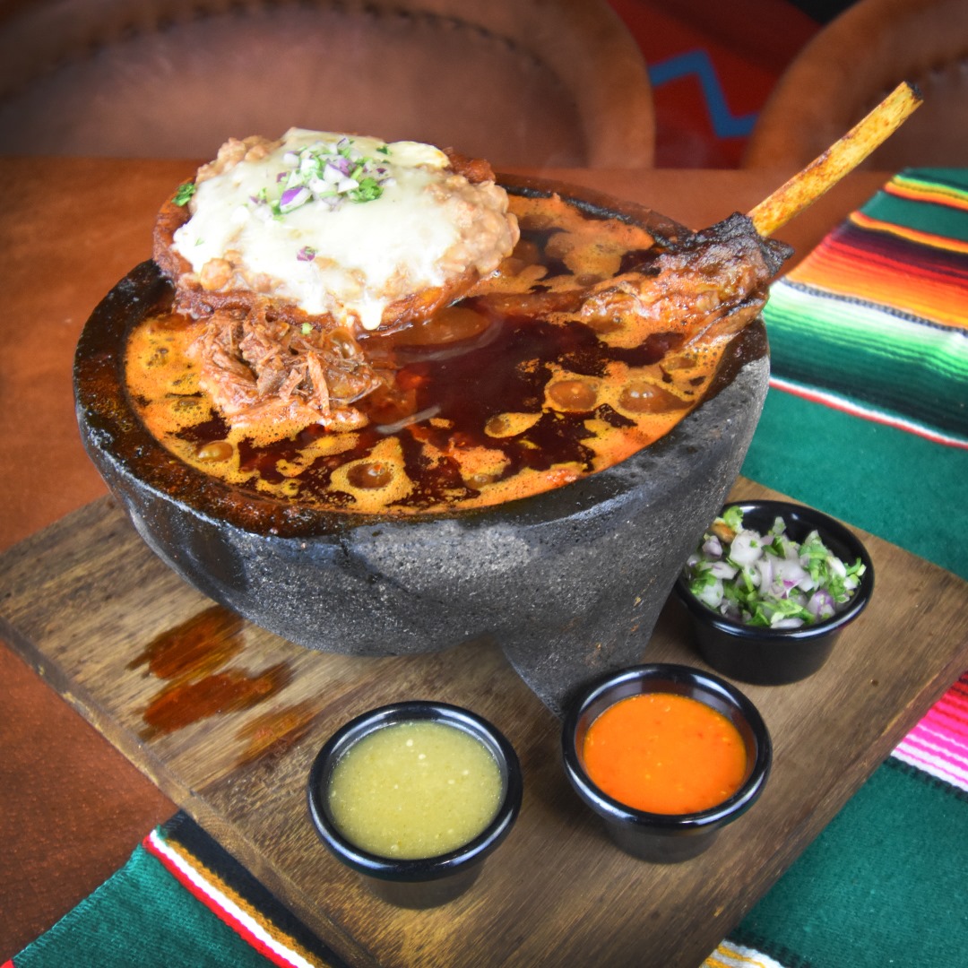 Mini caldo de res, 2 tacos dorados y 1 tostada.