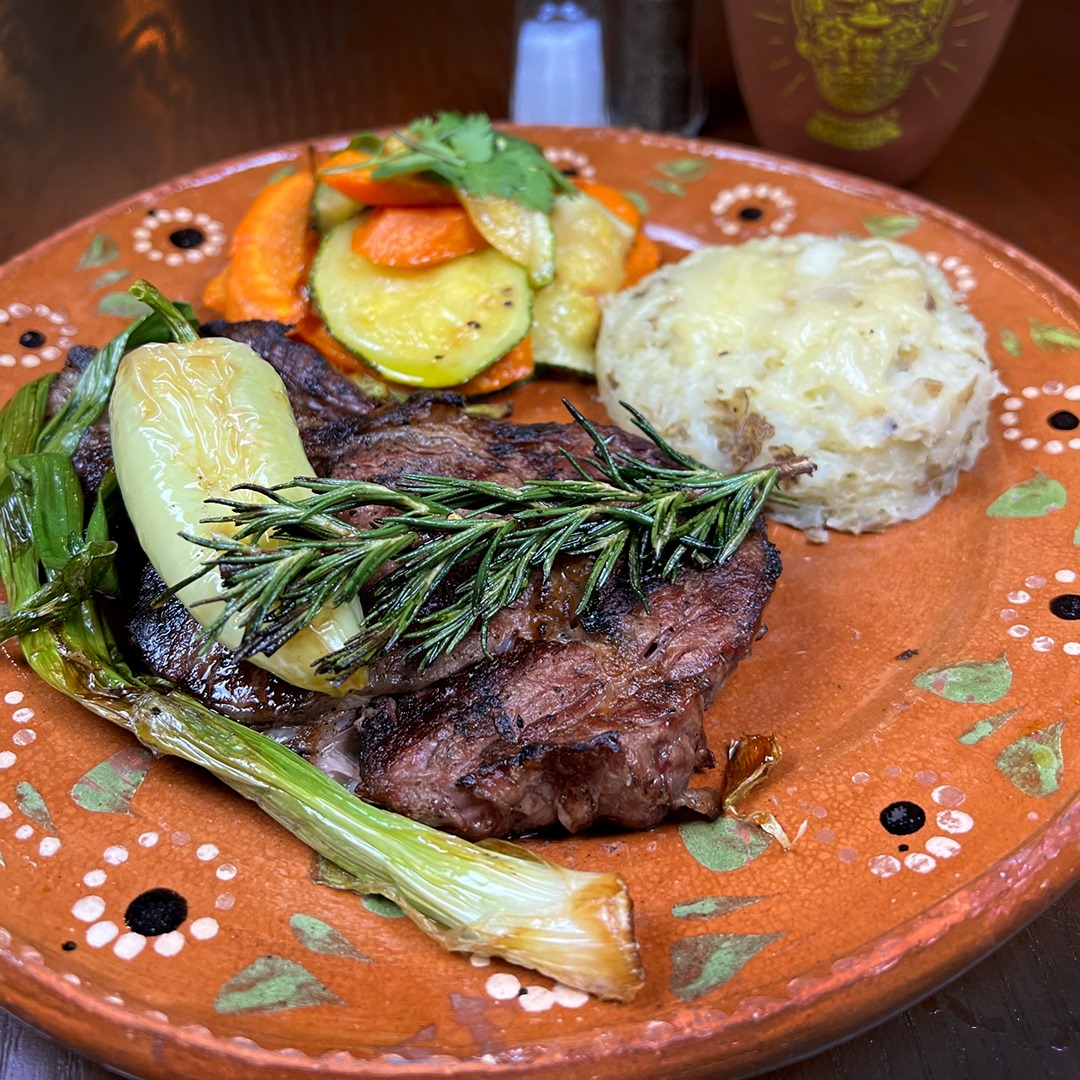 New york 400 g, camarones envueltos con tocino 6 uds, arrachera 300 g, champiñones rellenos de queso mozzarella 8 uds, morrón y cebolla a la plancha, costras de queso mozzarella 2, chiles caribe, jalapeños y nopalitos asados, 1 chalupe de queso fundido con chorizo y rajas, 1 chalupa de frijolitos refritos.