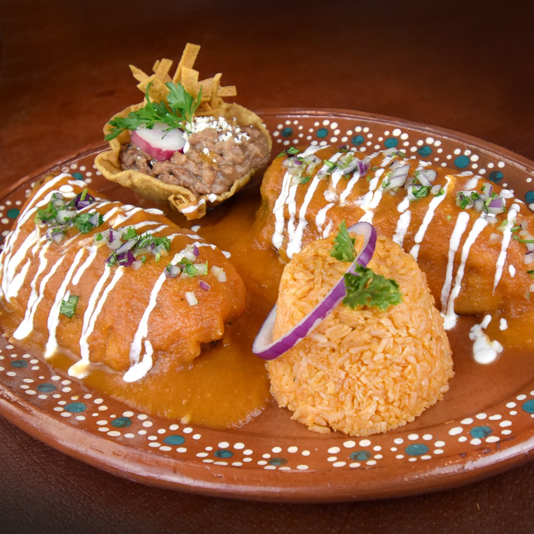 Acompañado de frijoles refritos, arroz rojo y 1 enchilada.