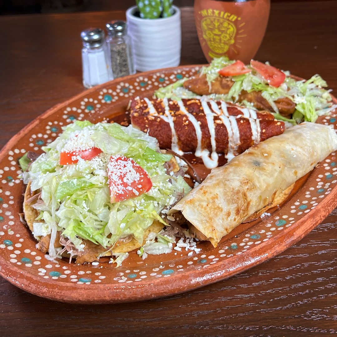 1 Tostada res o pollo, 1 sope adobado y 2 tacos dorados.
