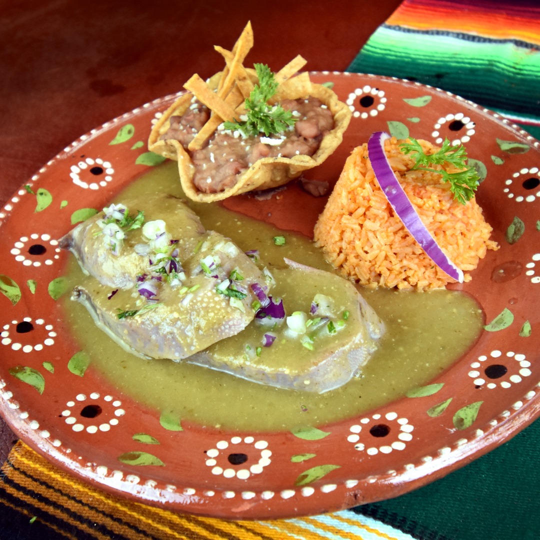 Servido en una cama de guacamole, acompañado de chiles toreados.
