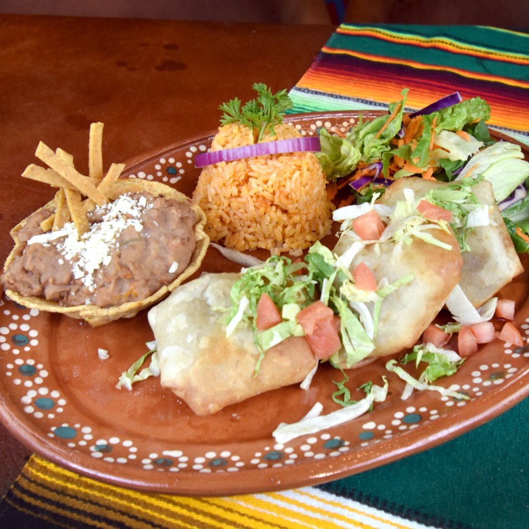 1 Chimichanga, tostada, 2 enchiladas res o pollo, 1 burrito de machaca.