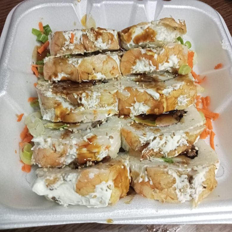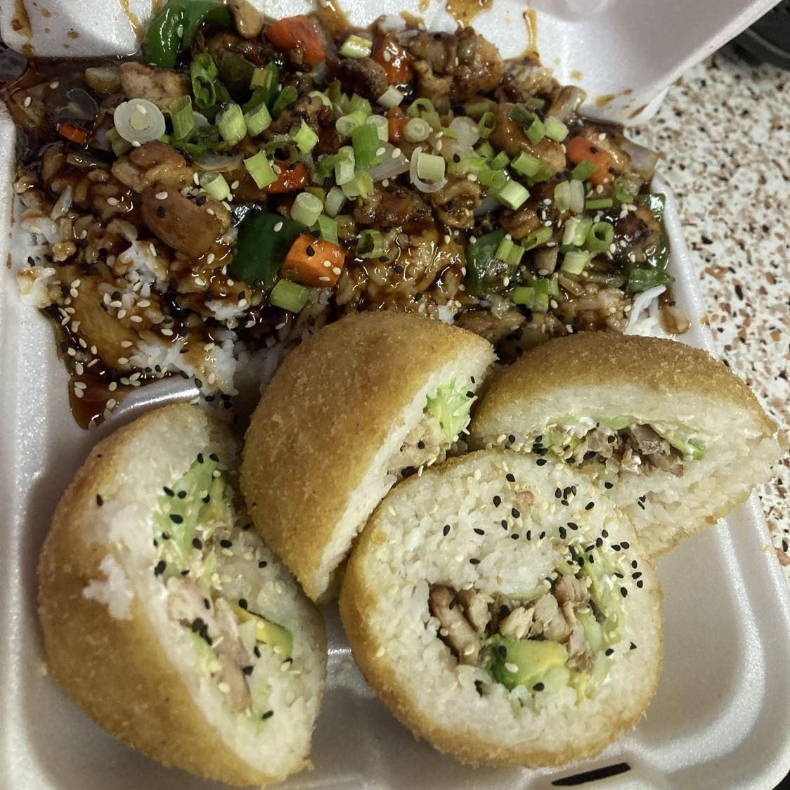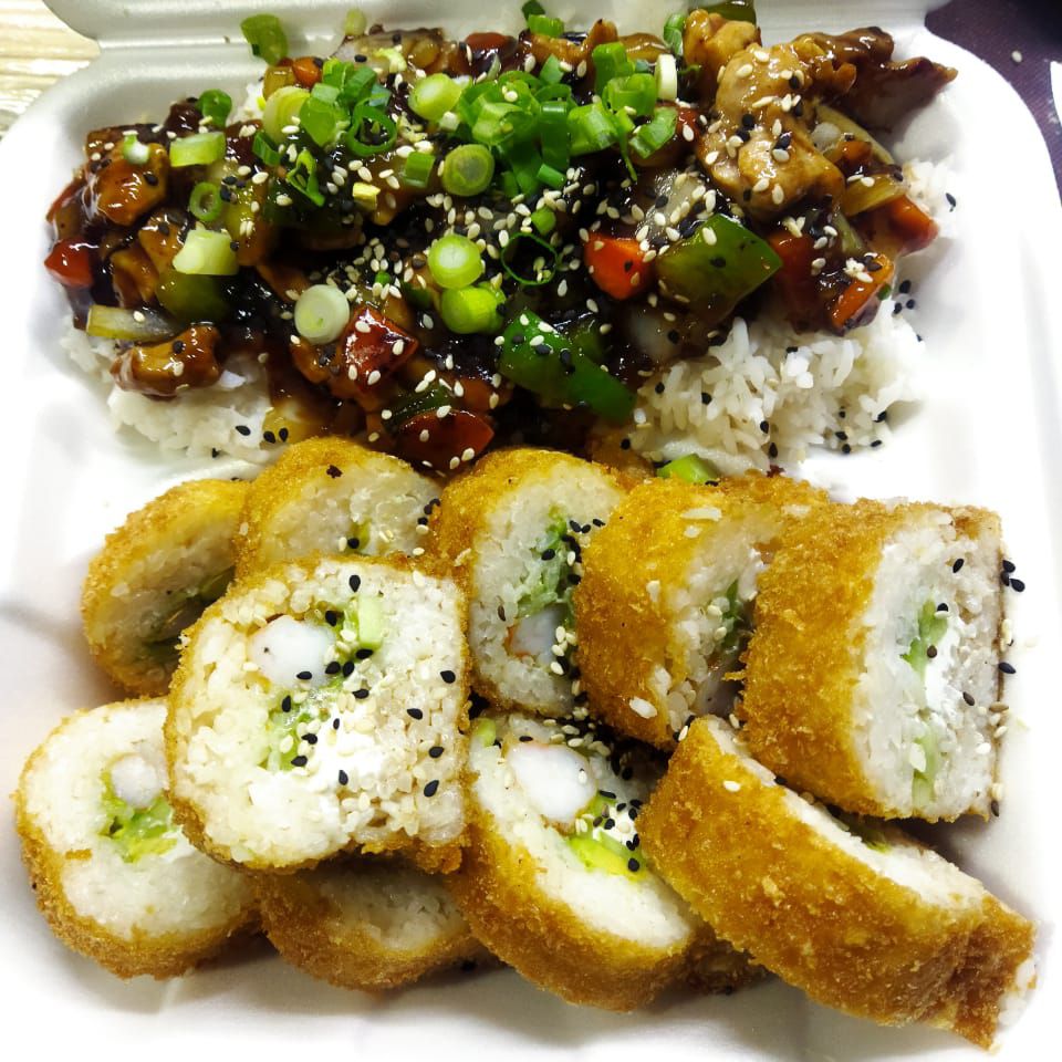 2 Sushibolas de pollo y media orden de teriyaki de pollo.