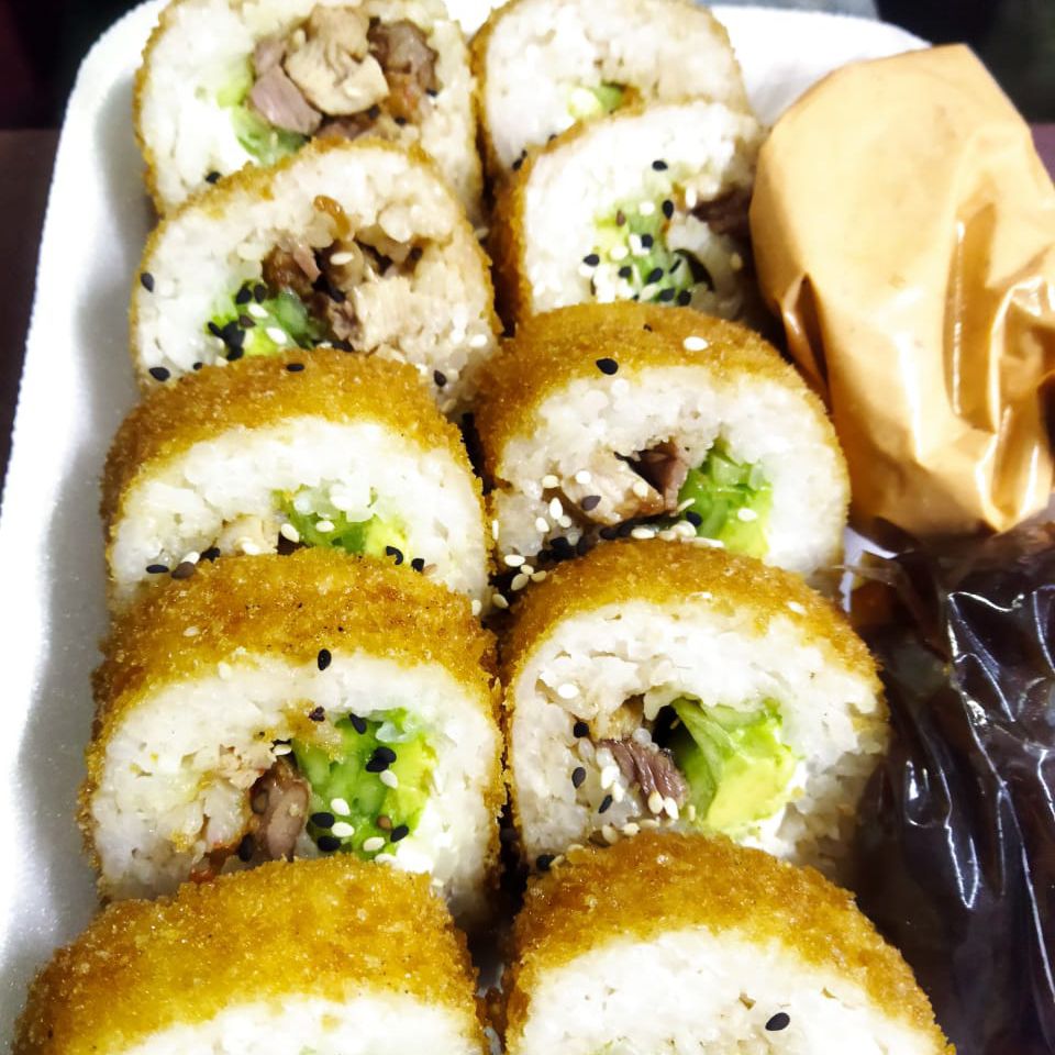 Carne,camaron,pollo,pepino,aguacate y queso philadelphia
