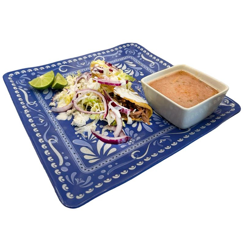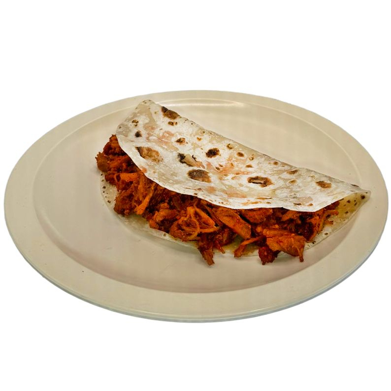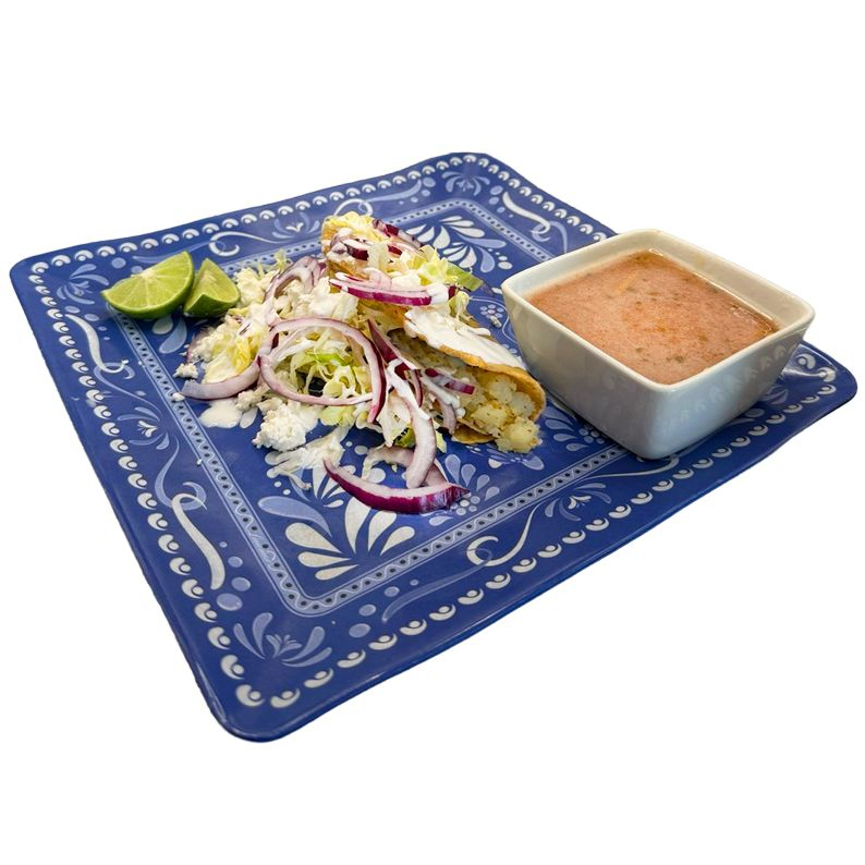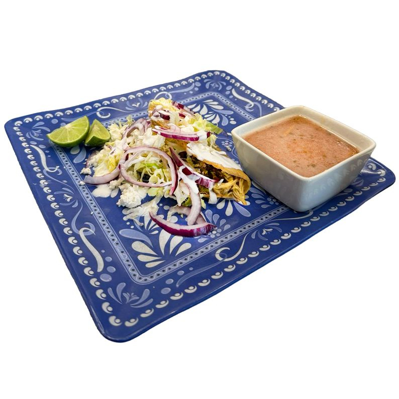Taco frito relleno de pechuga de pollo deshebrada y bien sazonada.