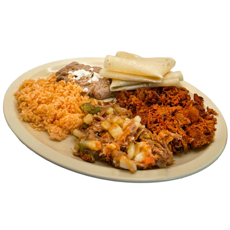 Paquete completo que incluye dos guisados a elección, acompañados de frijoles, arroz, salsa y tortillas.