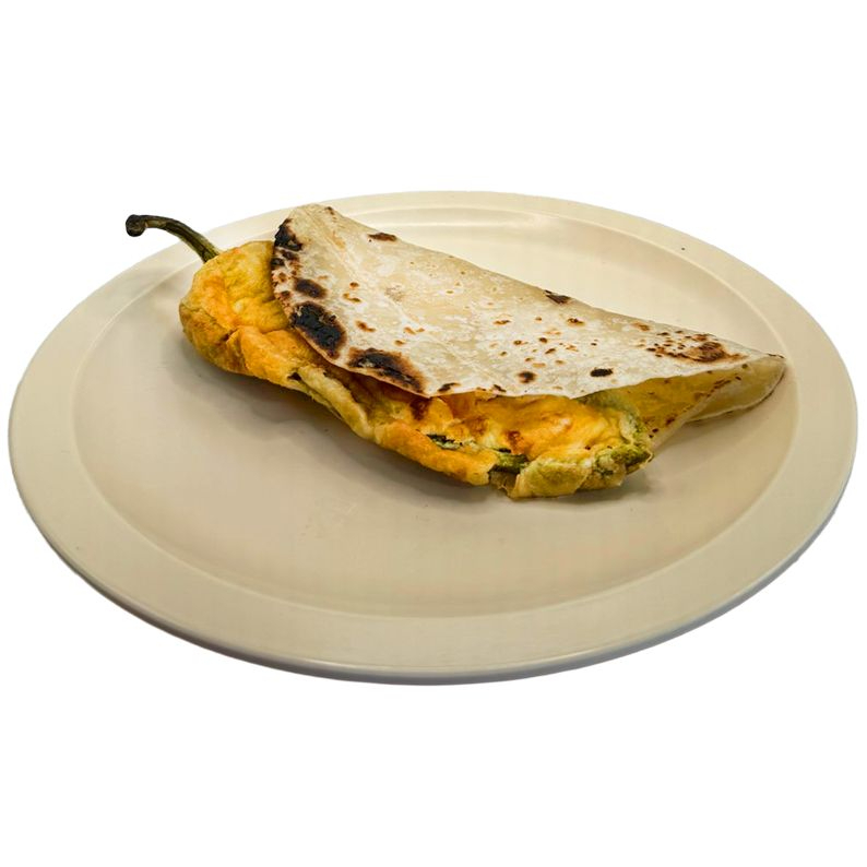 Chile relleno de queso, capeado y servido en tortilla de maíz.