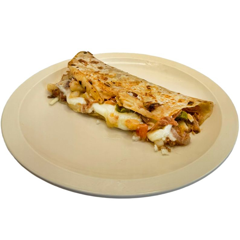 Tortilla con queso fundido y tu elección de guisado del menú.