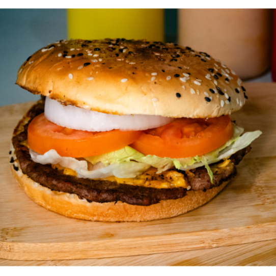 Carne de res jugosa a la parrilla, queso derretido, lechuga, tomate y aderezo especial, en pan suave.