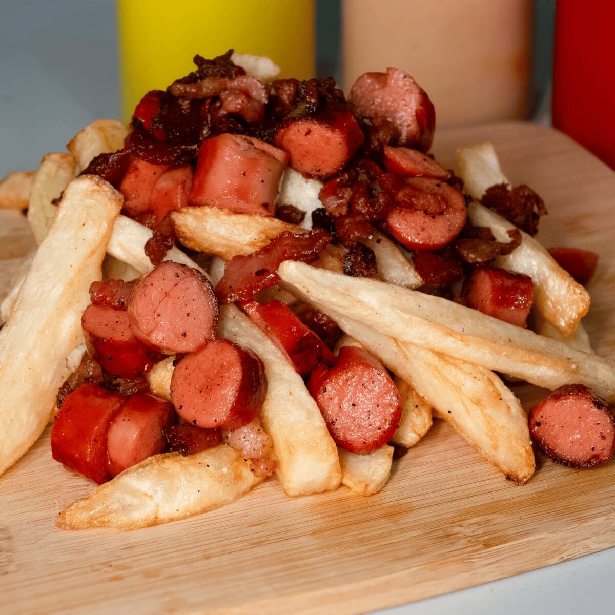 Combinación de papas fritas con rebanadas de salchicha frita, bañadas en aderezos.