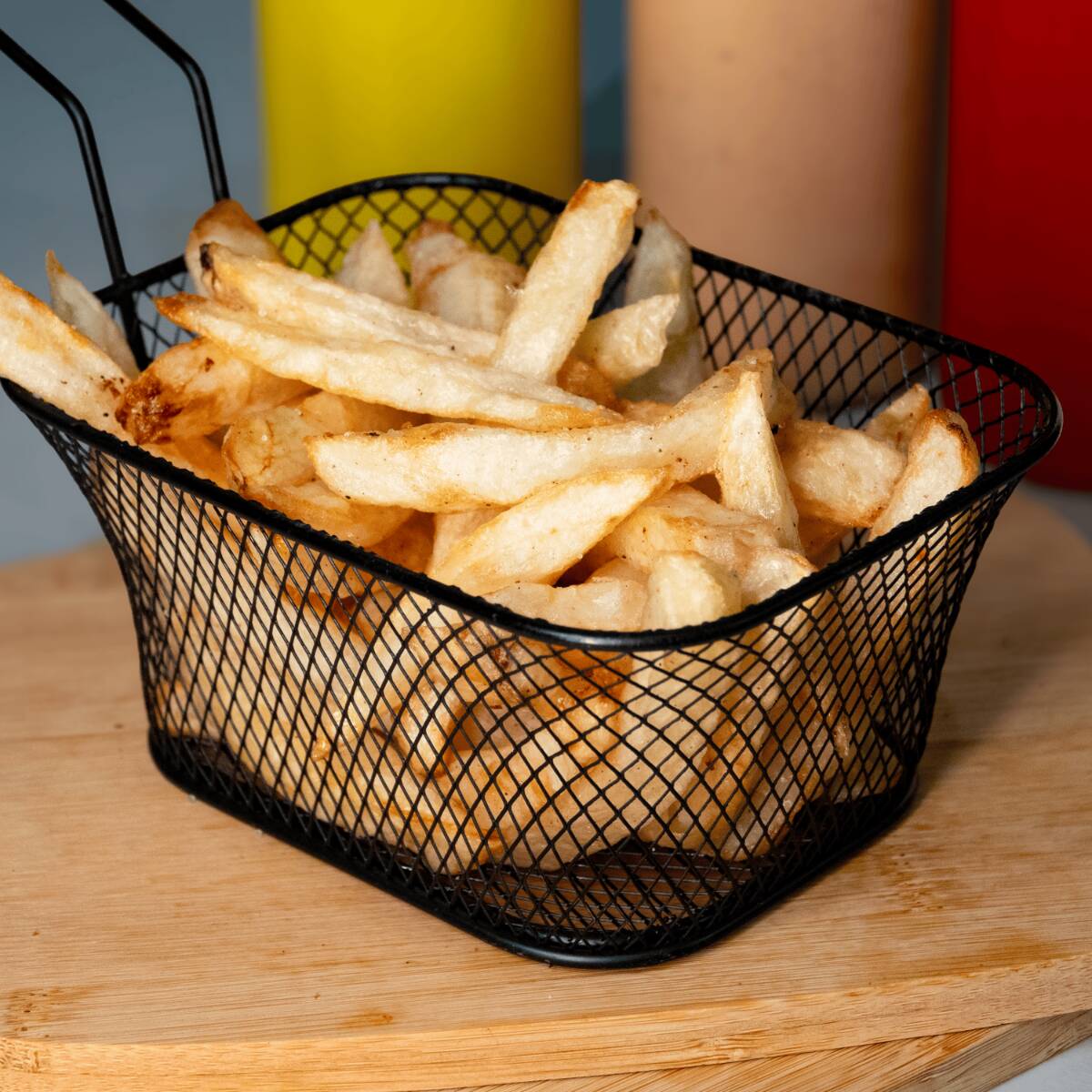 Porción grande de papas fritas crujientes, ideales para acompañar cualquier platillo.