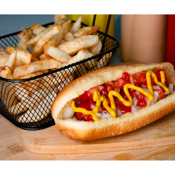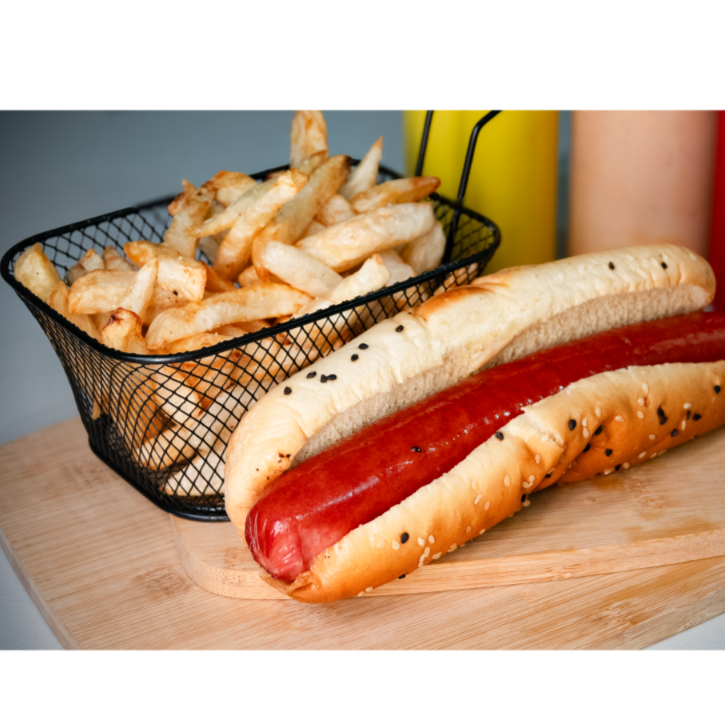 Salchicha 1/4 libra de res ,servida en pan y acompañada de papas fritas.