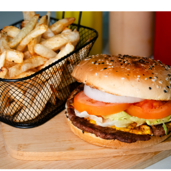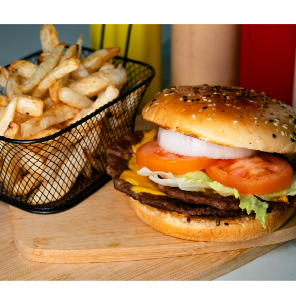Carne de res jugosa a la parrilla, queso derretido, lechuga, tomate y aderezo especial, servida con una porción de papas fritas crujientes.