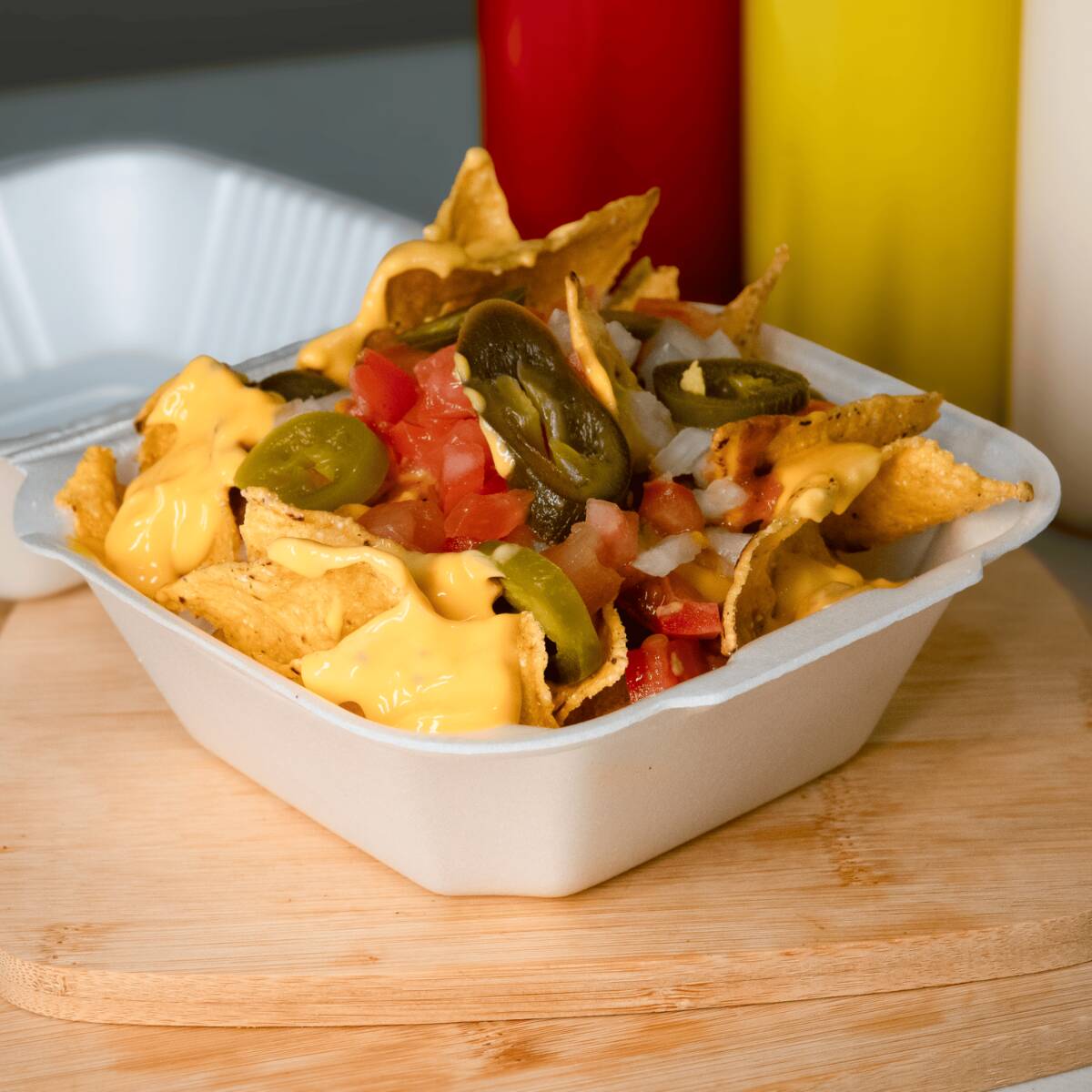 Totopos de maíz crujientes cubiertos con queso cheddar fundido, jalapeños y aderezos.