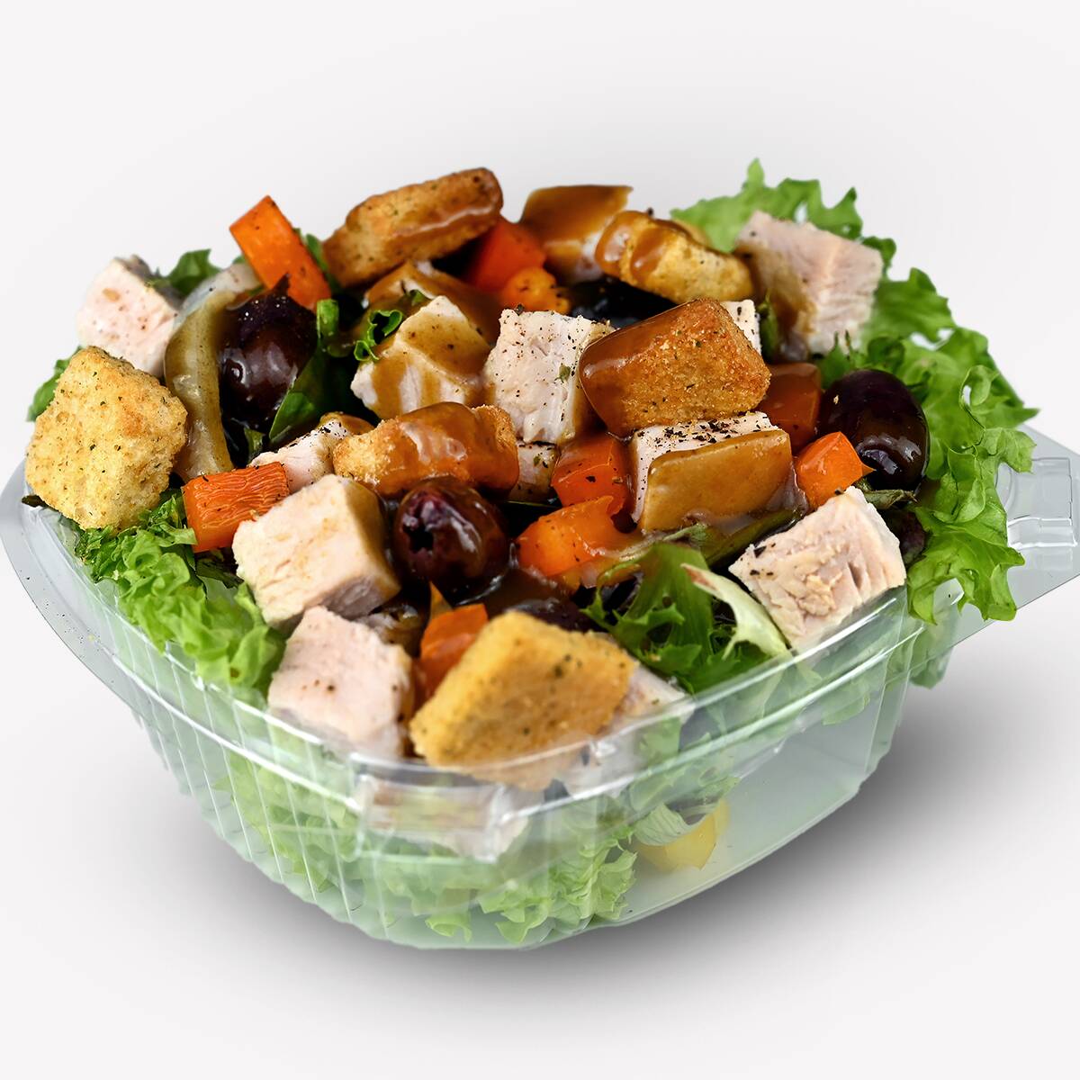 Mix de lechugas, pavo, aceituna, morrón, cebolla, pepino, crutones, vinagreta