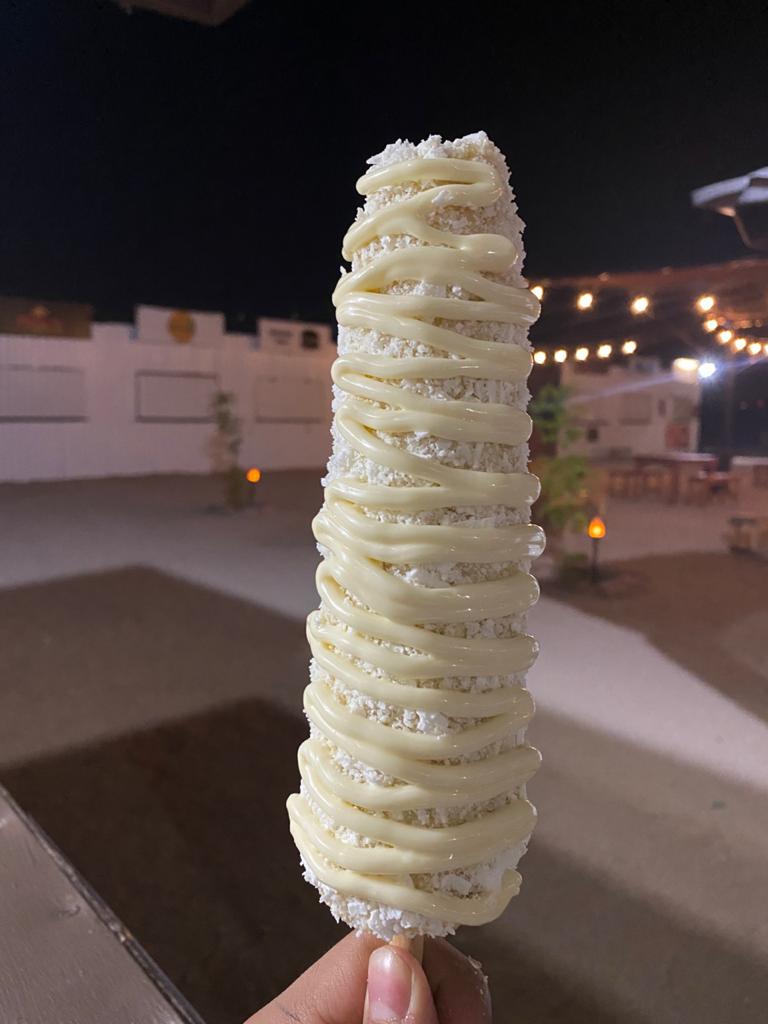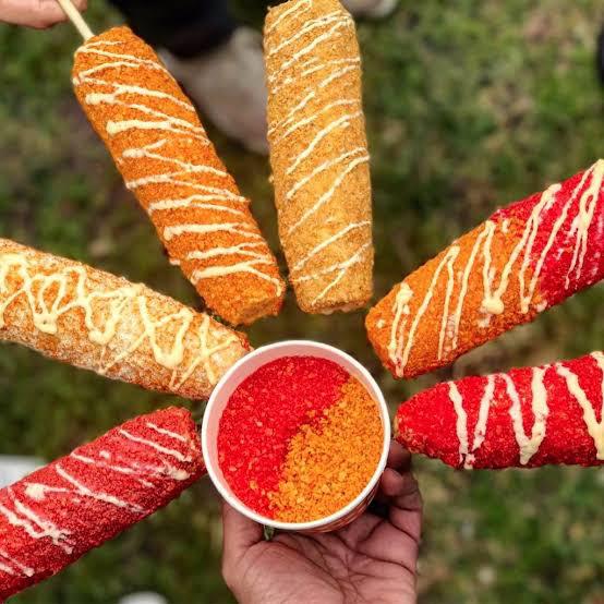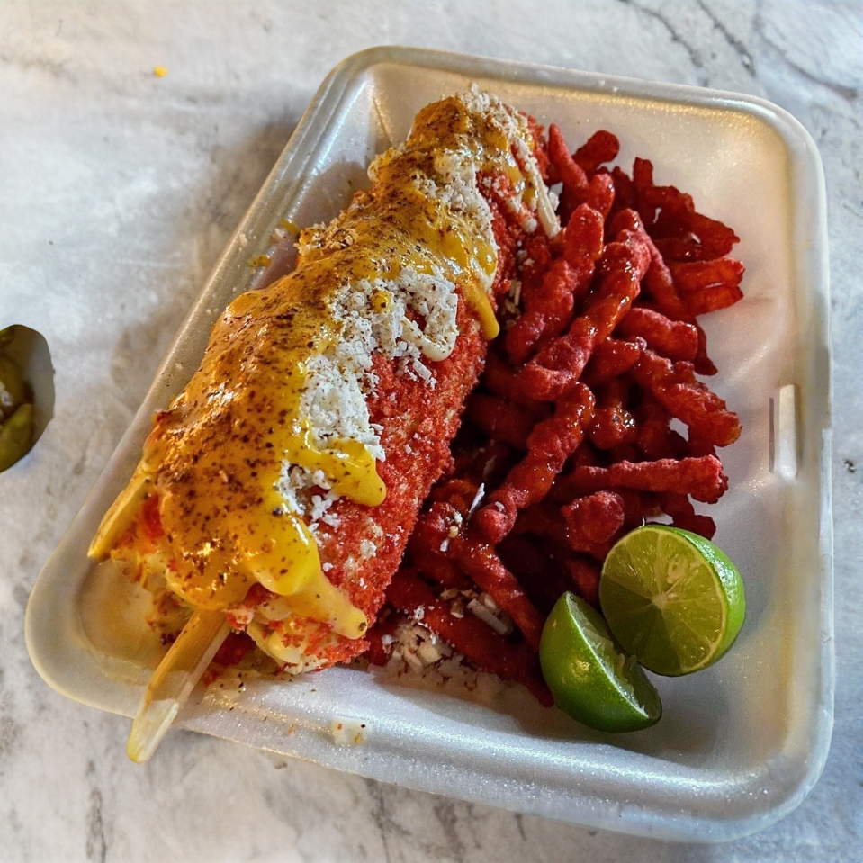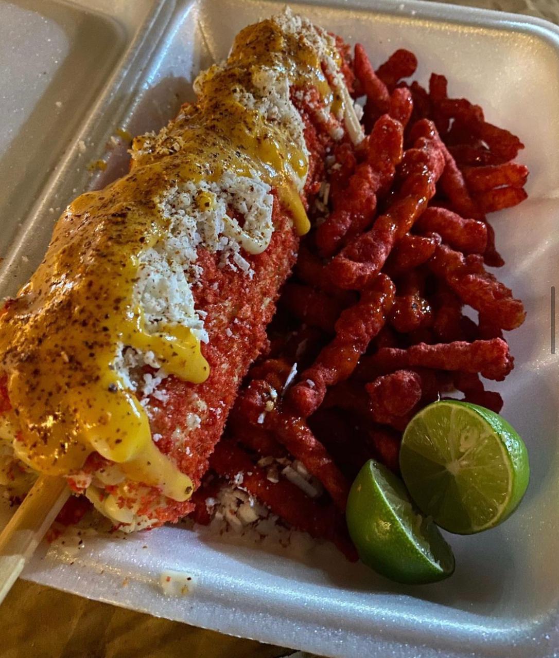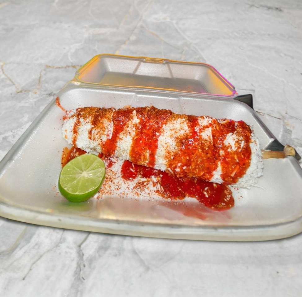 Elote forrado con Sabritas en trozos de su eleccion, preparado con mantequilla, queso rayado y limón.