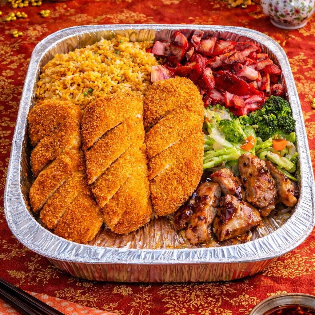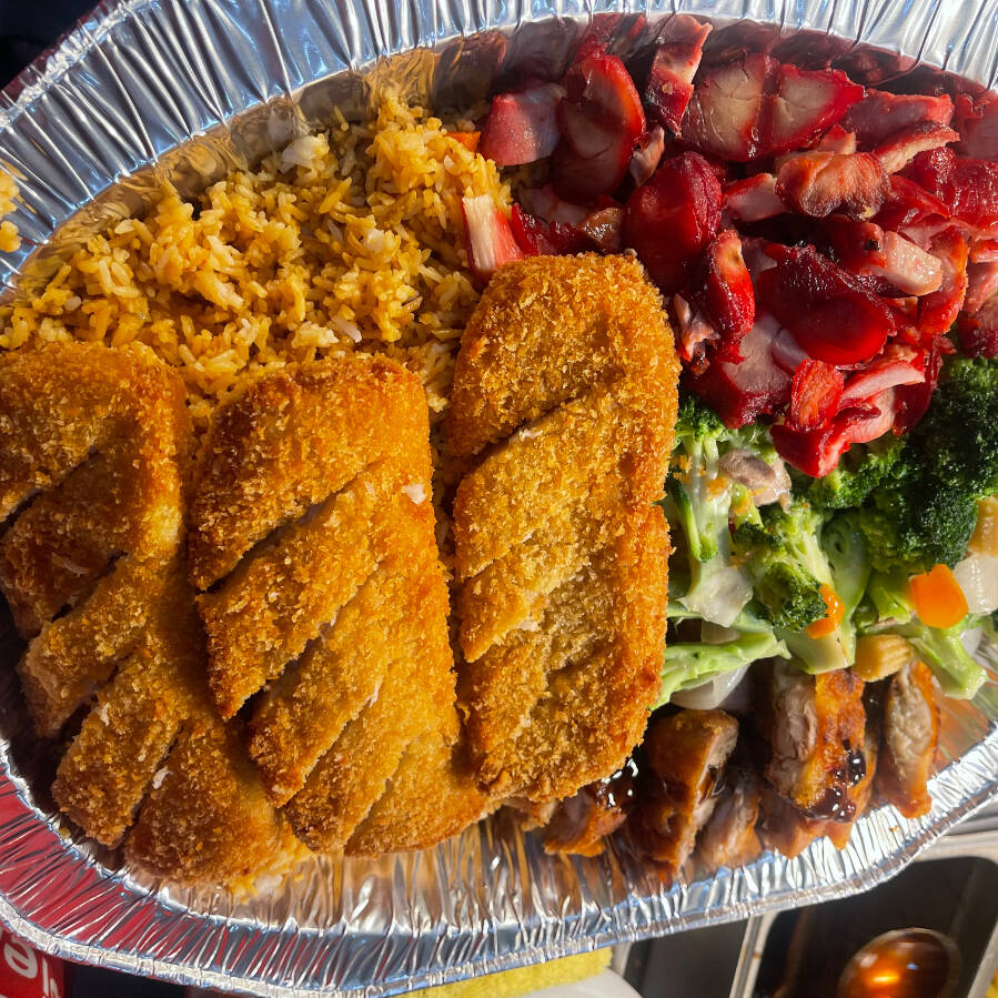 Arroz Frito*1 + Brócoli (de Pollo)*1 + Pollo Plancha*1 + Carnitas Rojas (de Pollo)*1 + Pescado Empanizado*1 + Promo Famosa China*1