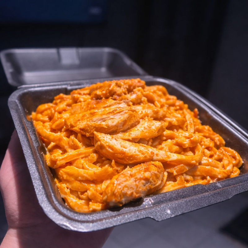 350 gramos de pechuga bañada en salsa Buffalo acompañada de papas fritas y aderezo Ranch