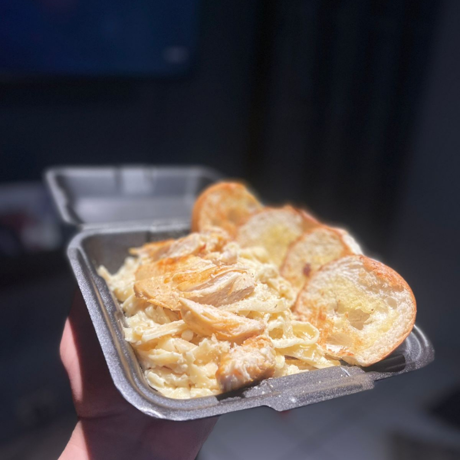 PASTA FETTUCCINE ALFREDO CON PECHUGA DE POLLO Y PANECITOS CON MANTEQUILLA Y PARMESANO