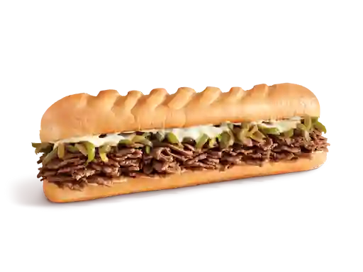 Sándwich de 30 cm con bistec, queso provolone, cebollas, pimientos verdes caramelizados, mayonesa y mostaza deli style, tamaño a elegir.