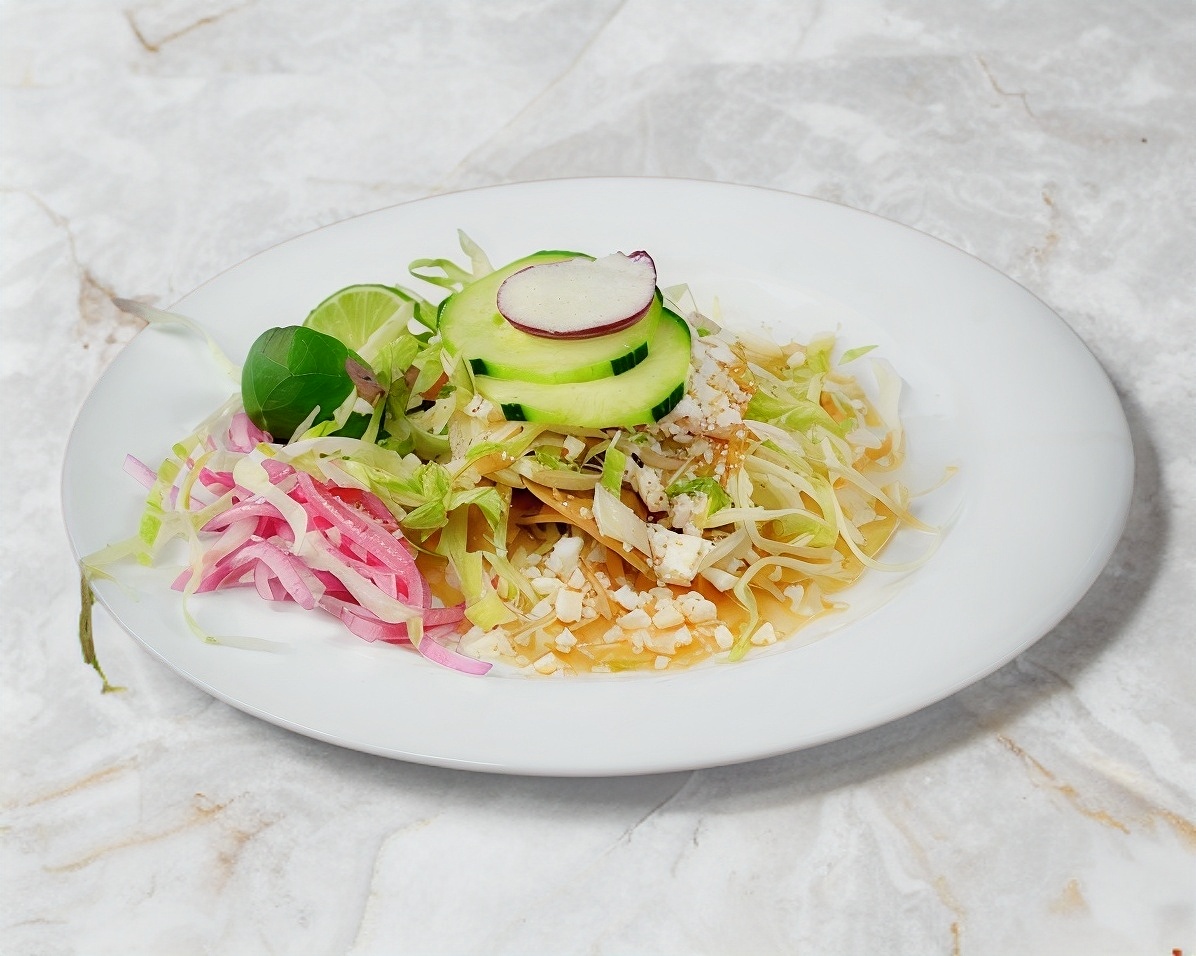 1 pza con una base de frijol, carne deshebrada, queso, lechuga, pepino, rabano y salsa de tomate.