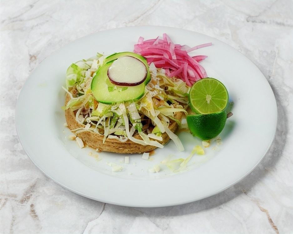1 pieza de sope con una base de frijol, carne deshebrada, lechuga, salsa de tomate, queso, pepino, rábano y cebolla morada.