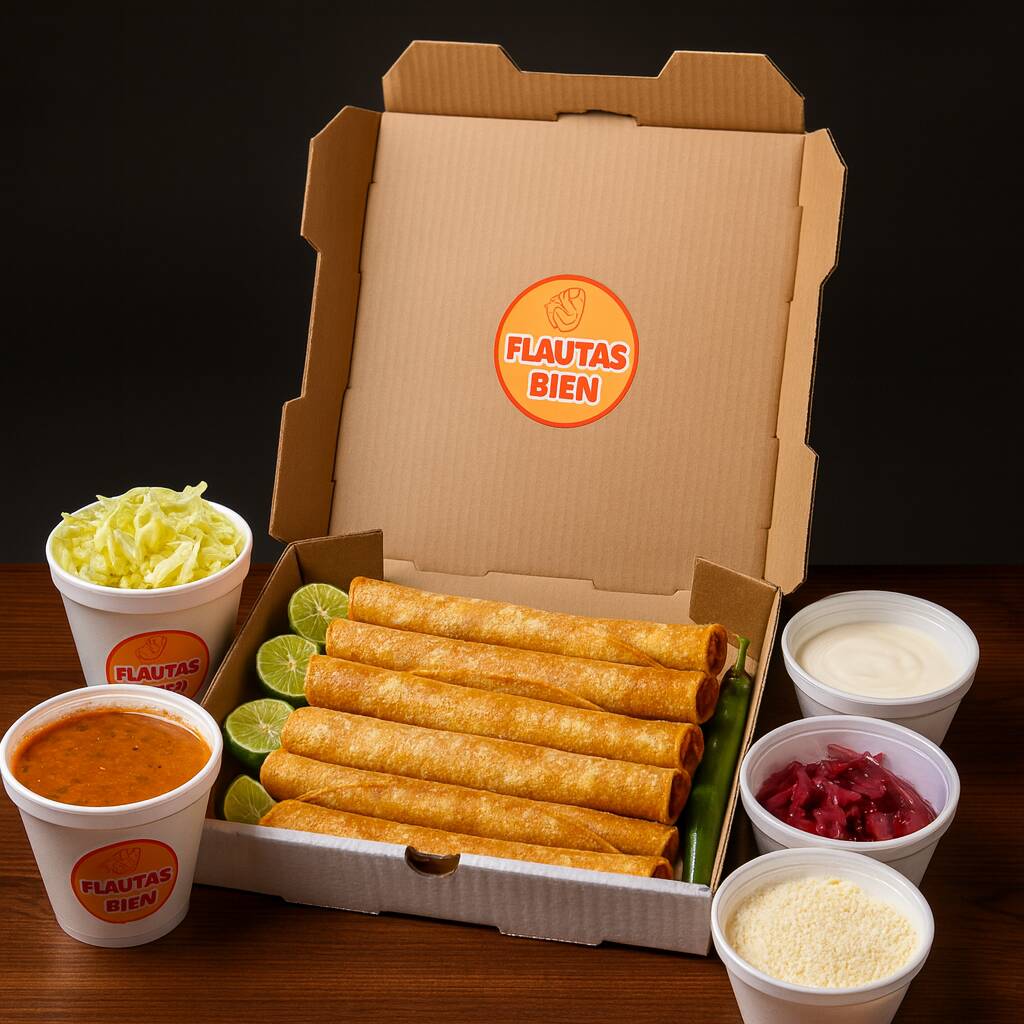 4 flautas bien grandes (22 cm), bien rellenas, y bien servidas y un agua fresca a elegir - ¡perfectas para ese antojo manchoso! Todos los complementos vienen servidos por separado.