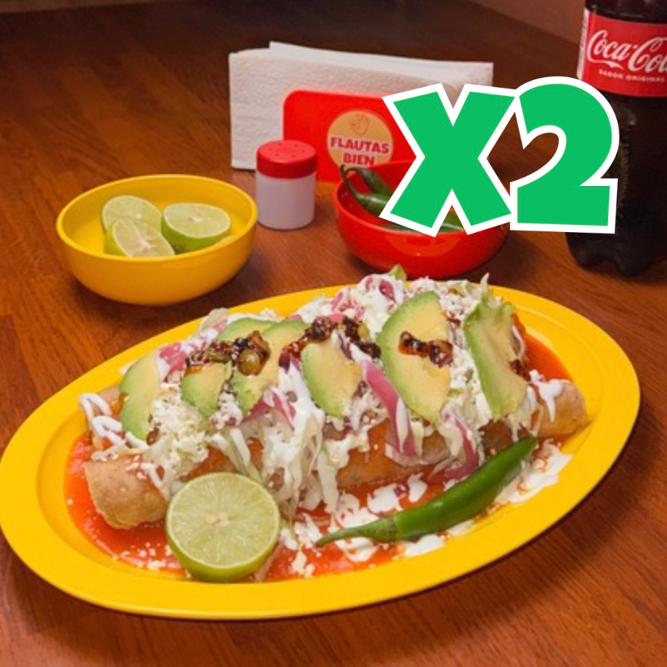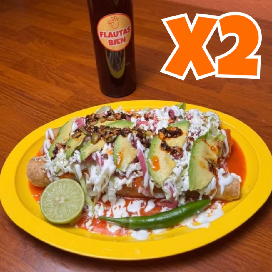2 flautas bien grandes (22cm), bien rellenas, y bien servidas y un agua fresca a elegir - ¡perfectas para ese antojo manchoso! Todos los complementos vienen servidos por separado.