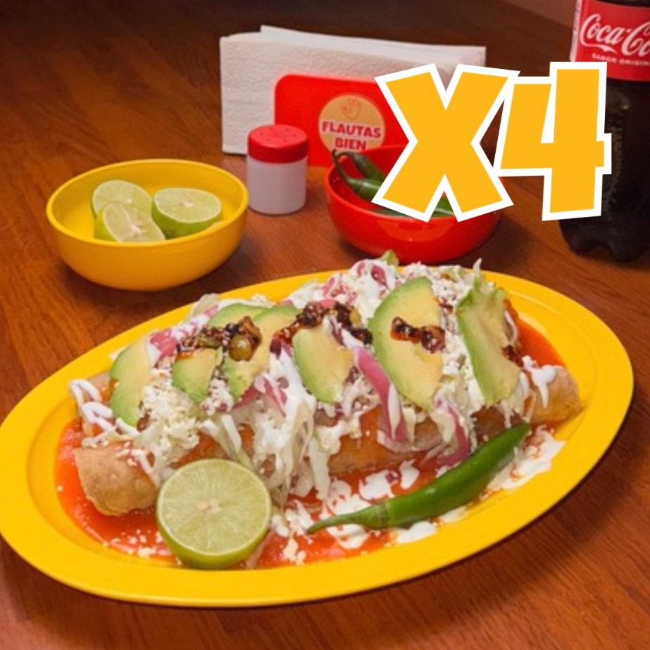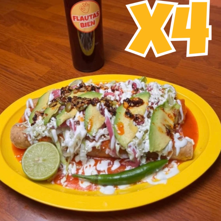 4 flautas bien grandes (22 cm), bien rellenas, y bien servidas. Elige tus rellenos y estilo preferido. Todos los complementos vienen servidos por separado.