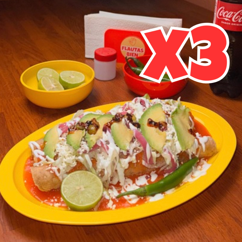 3 flautas bien grandes (22 cm), bien rellenas, y bien servidas y un agua fresca a elegir - ¡perfectas para ese antojo manchoso! Todos los complementos vienen servidos por separado.