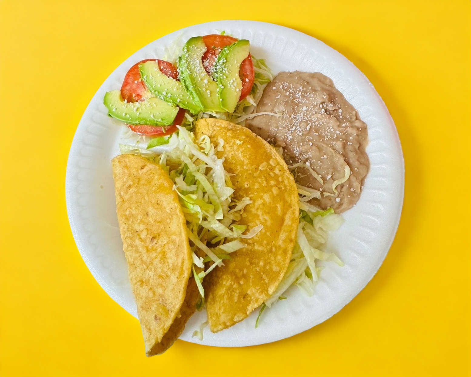 Orden de 3 tacos dorados de carne de res con una porcion de frijoles y ensalada