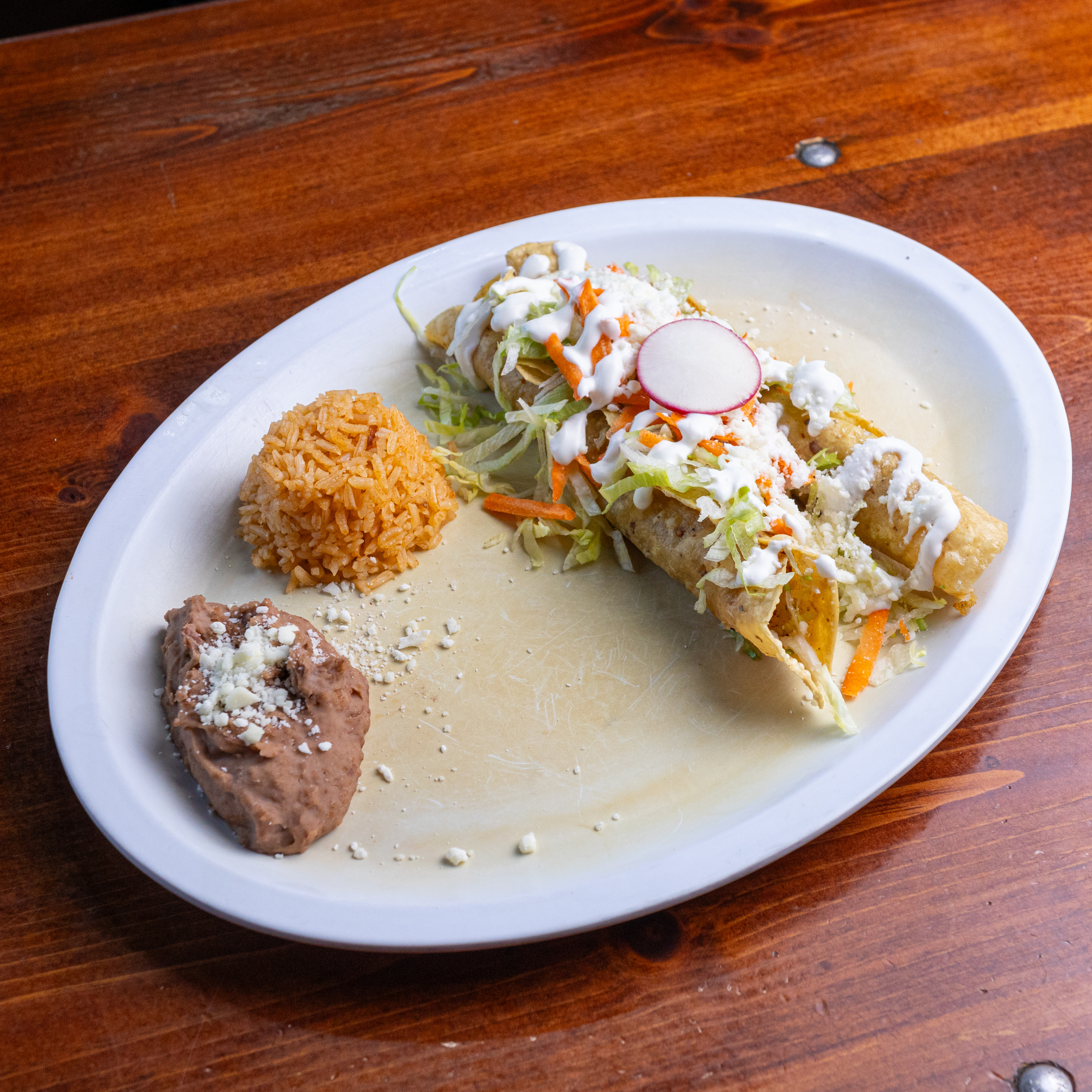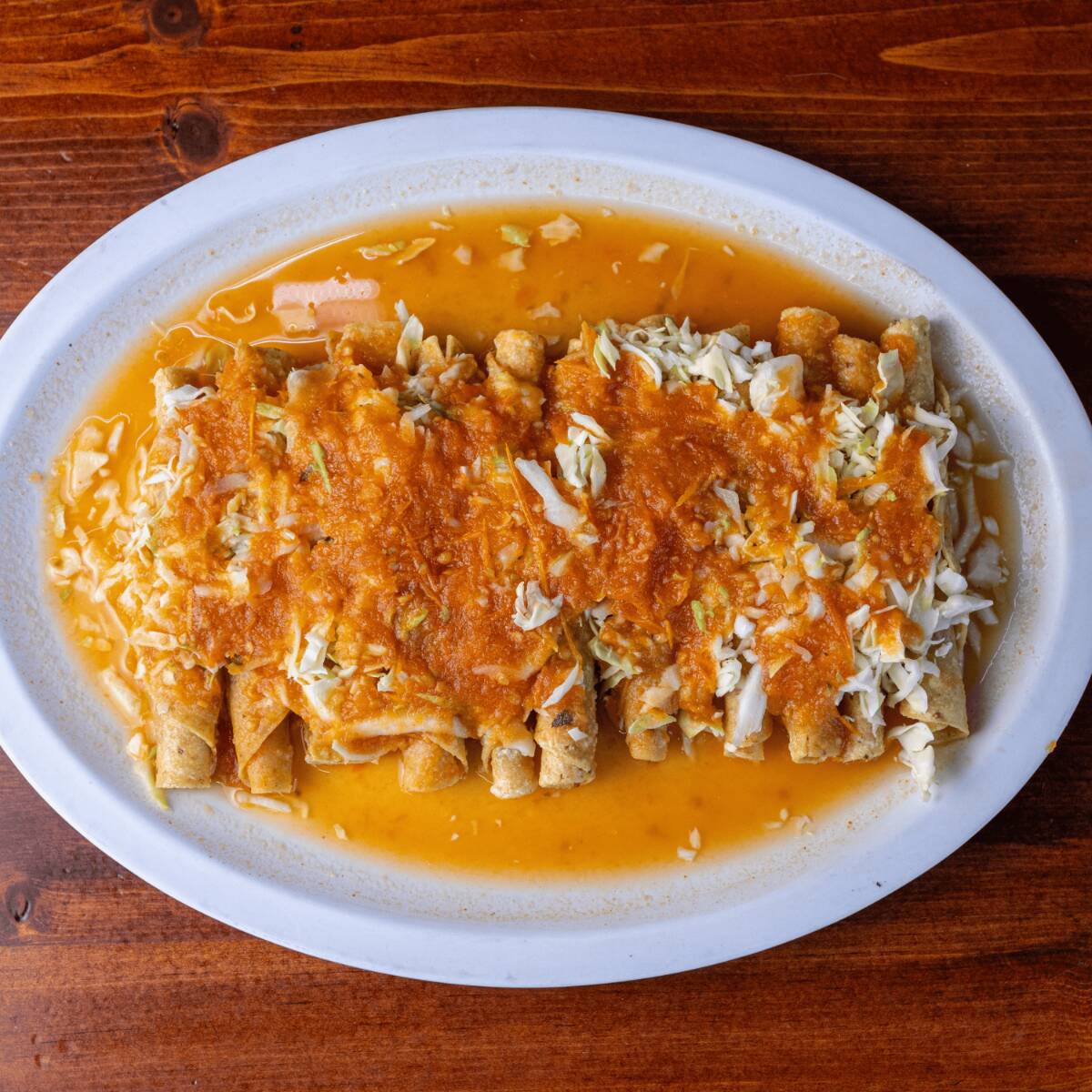 6 Flautas crujientes rellenas, porción perfecta para una comida ligera.