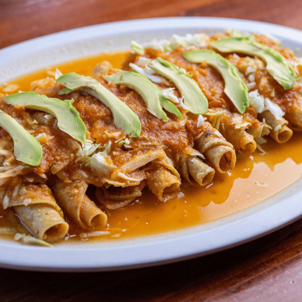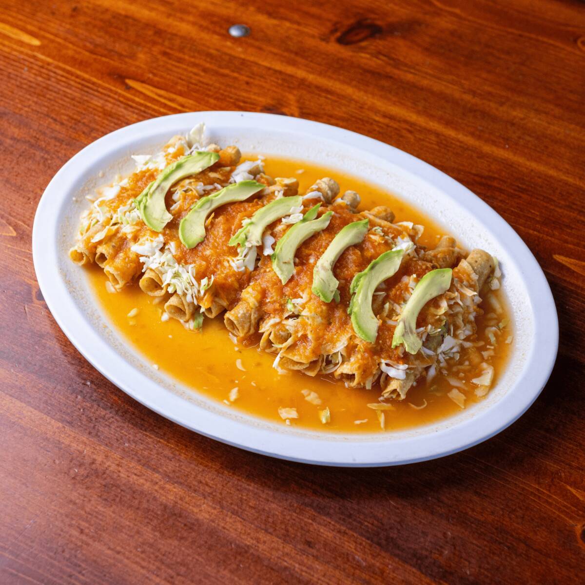 12 Flautas acompañadas con rebanadas frescas de aguacate.