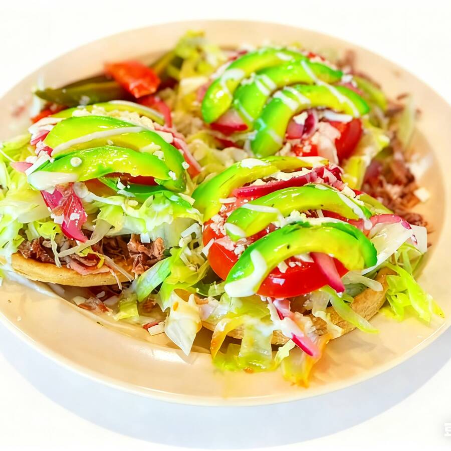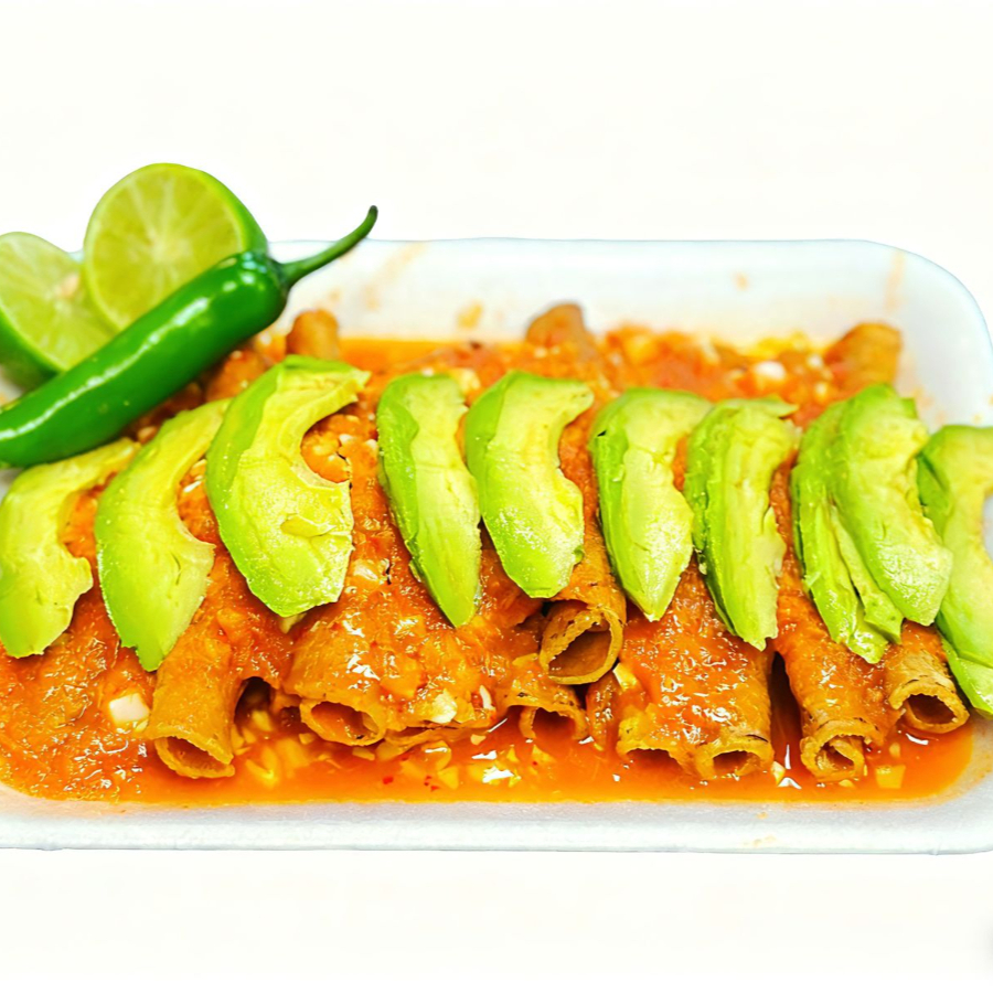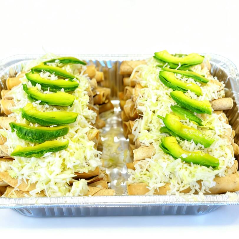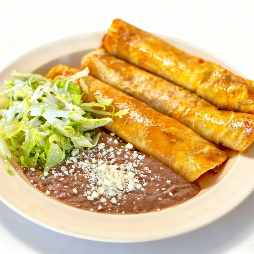 3 Tacos dorados de res c/ queso monterrey, acompañado de frijol, lechuga, tomate y aguacate