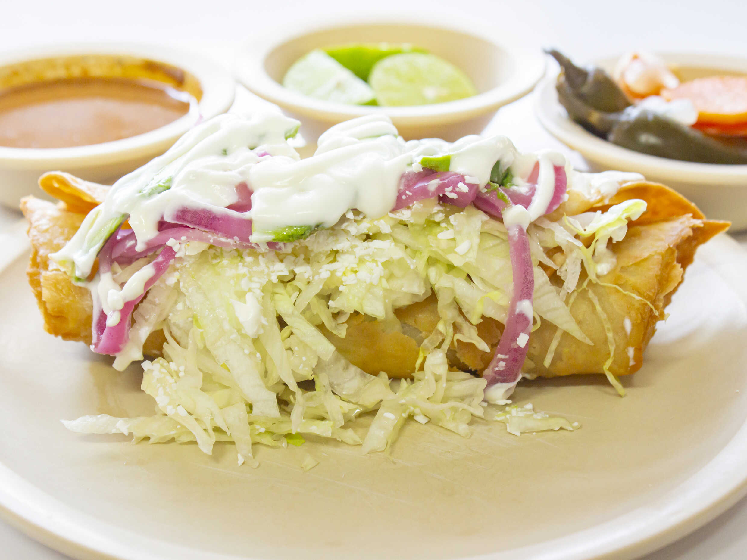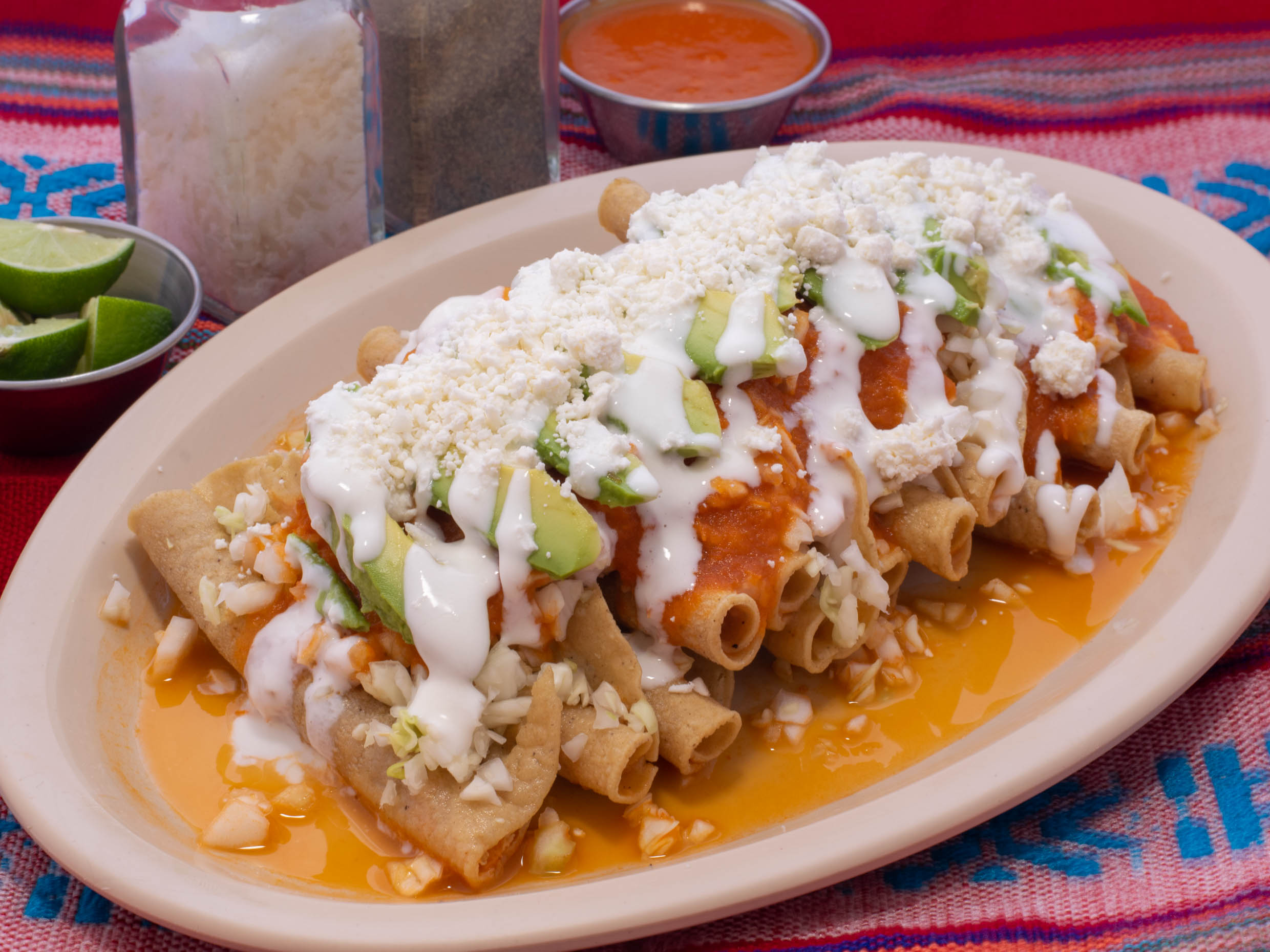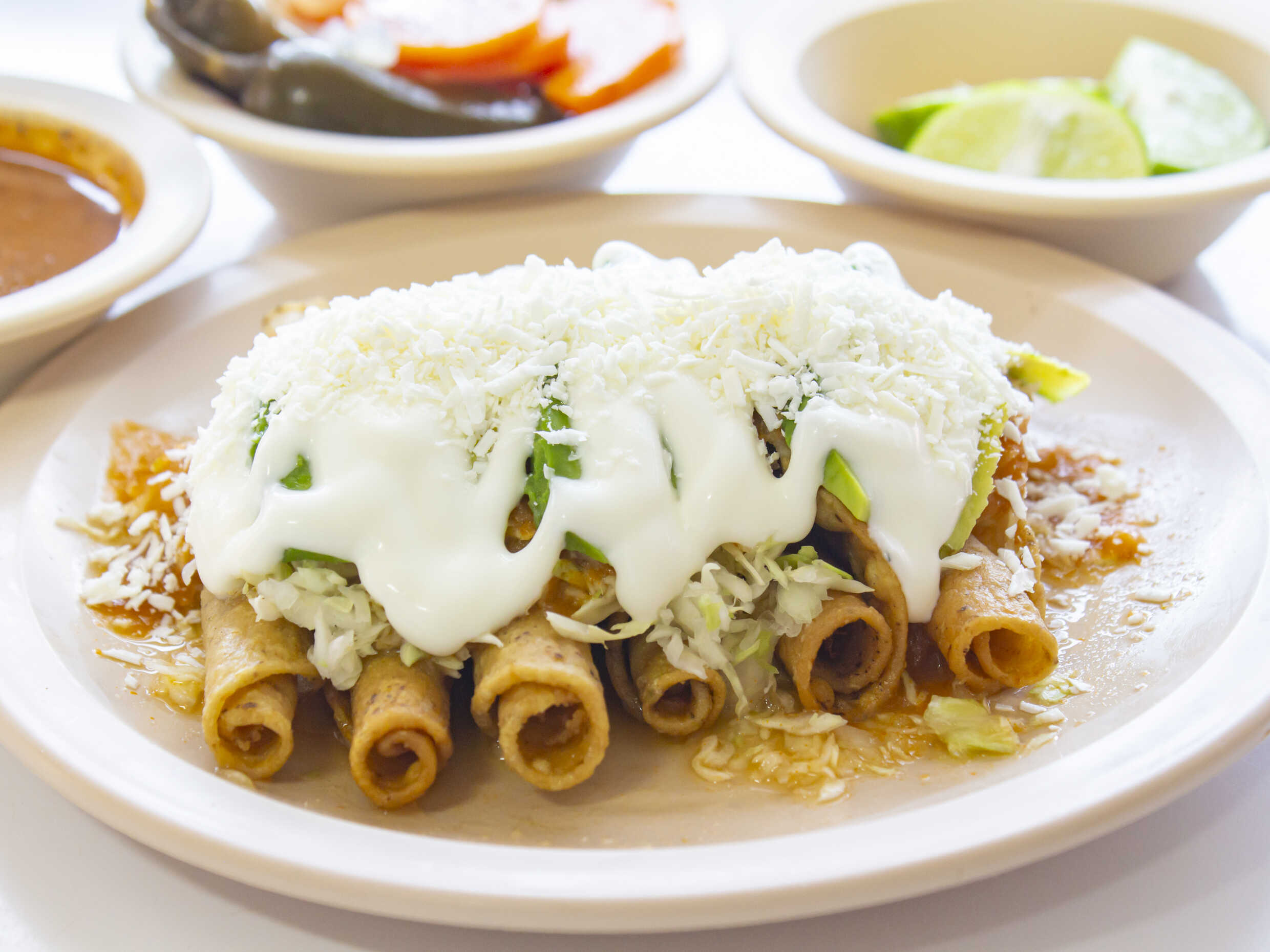 Docena de flautas de harina de maiz con Queso rayado tipo cotija y Crema, lechuga o repollo, con a sin agucate