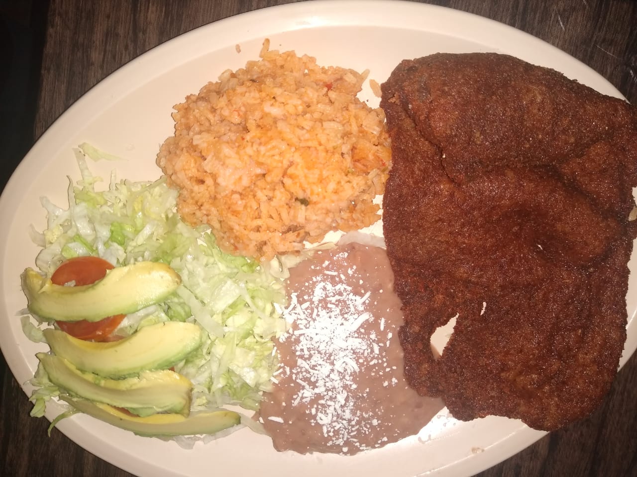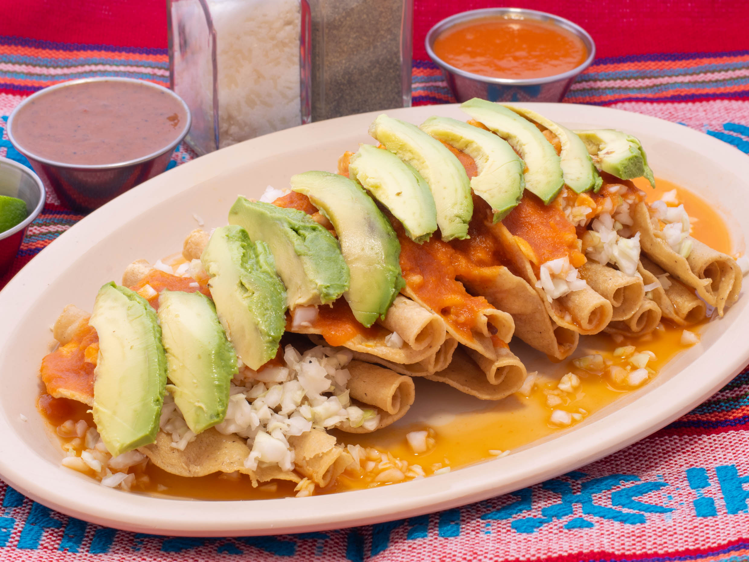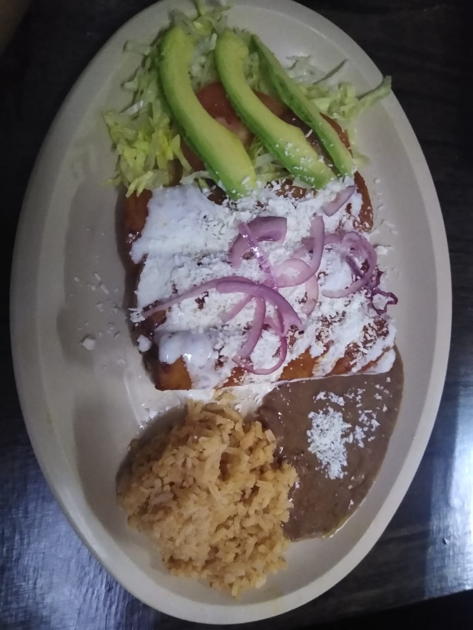 Enchiada Roja, con queso, crema, Lechuga, tomate, cebolla y aguacate.