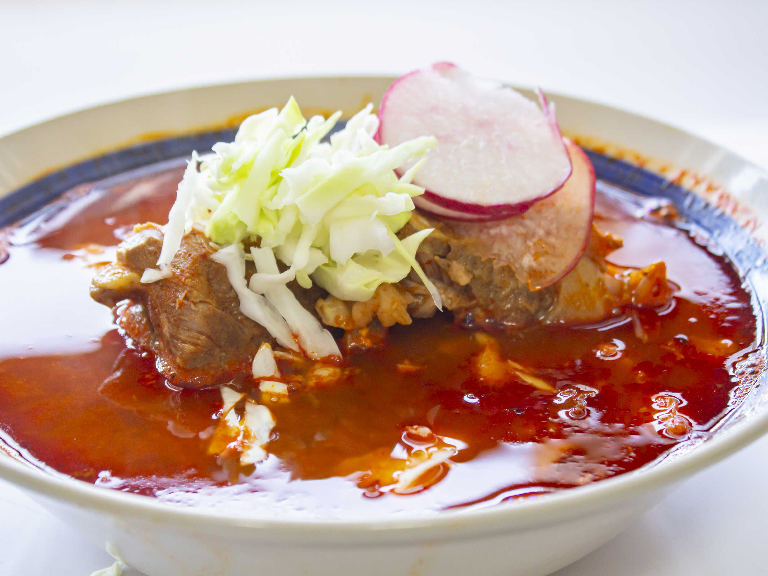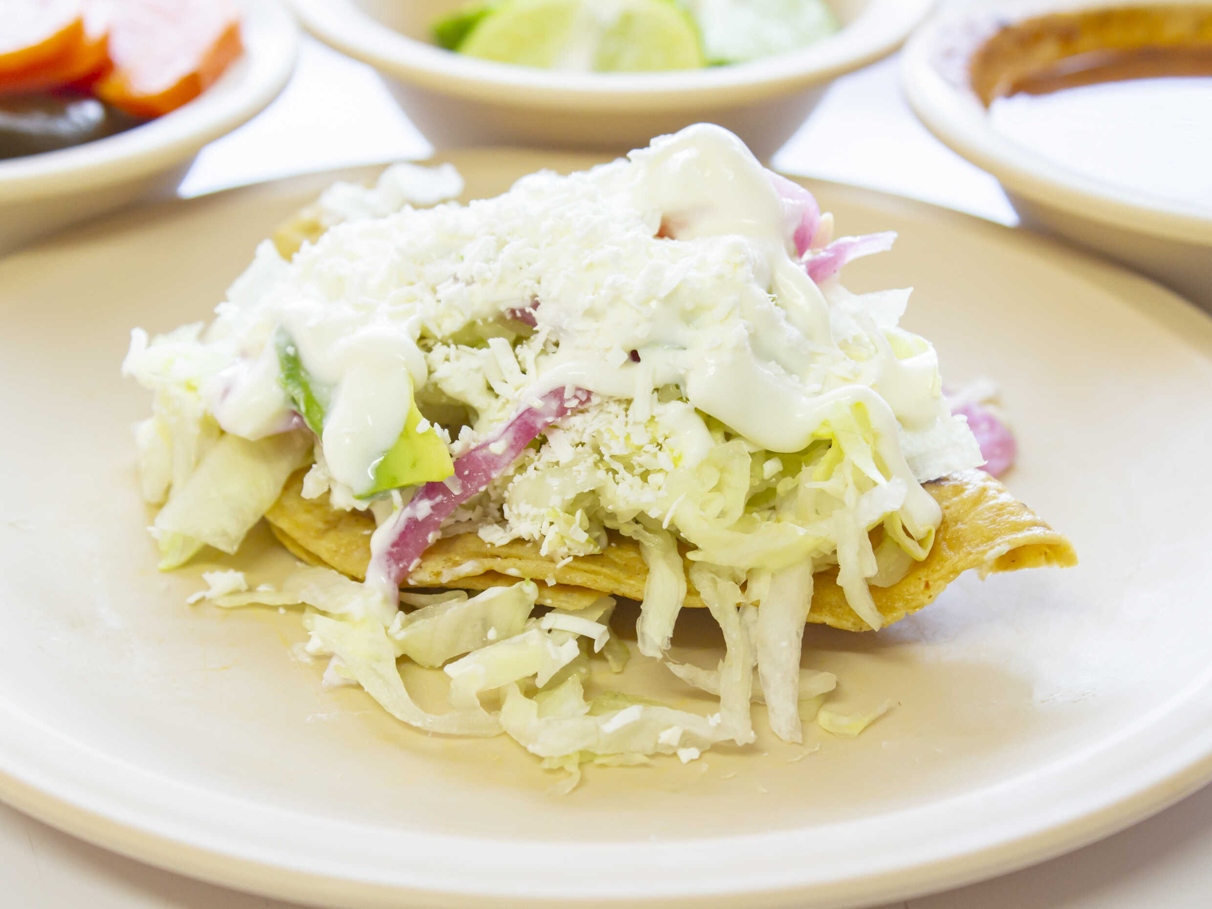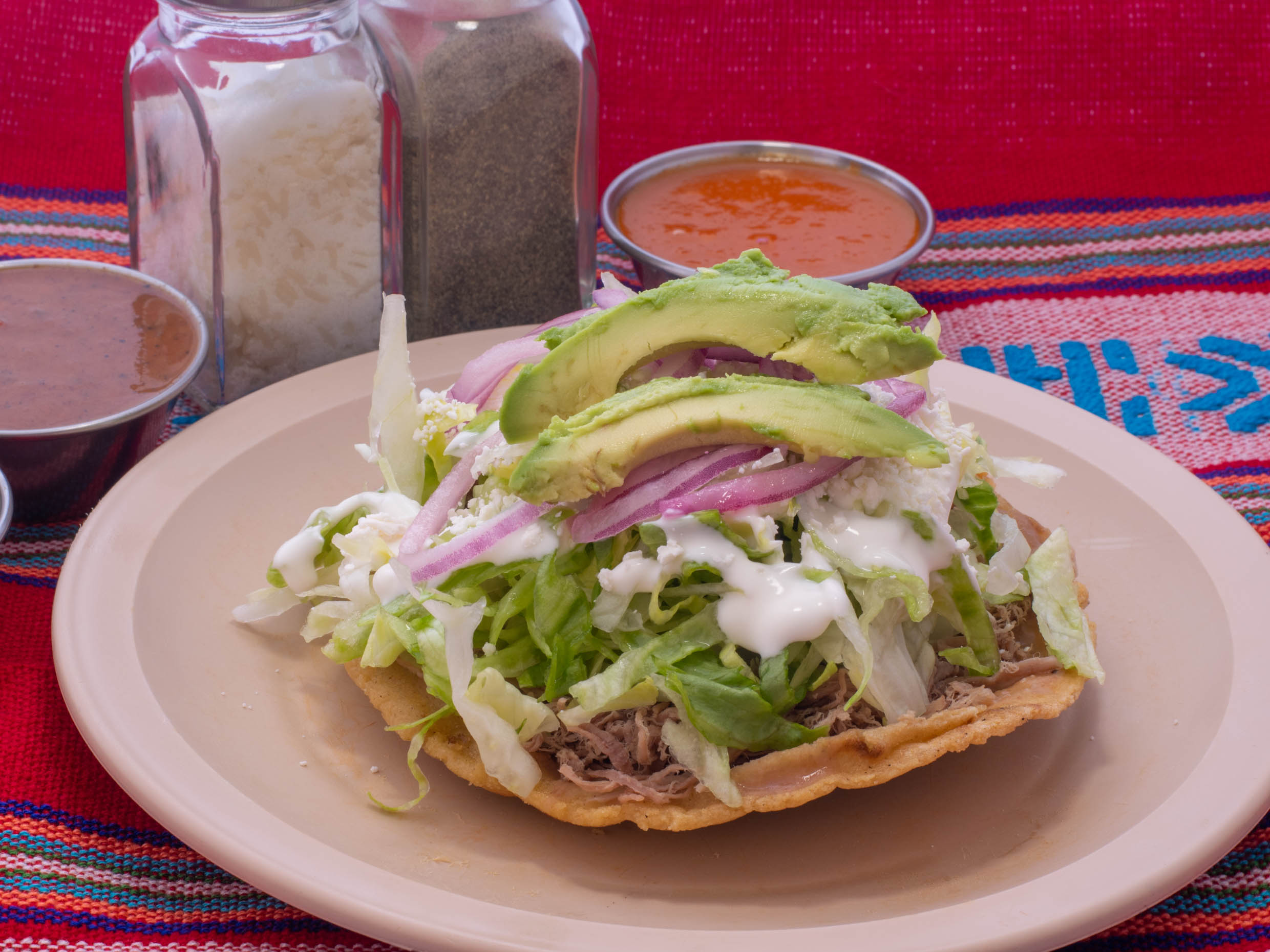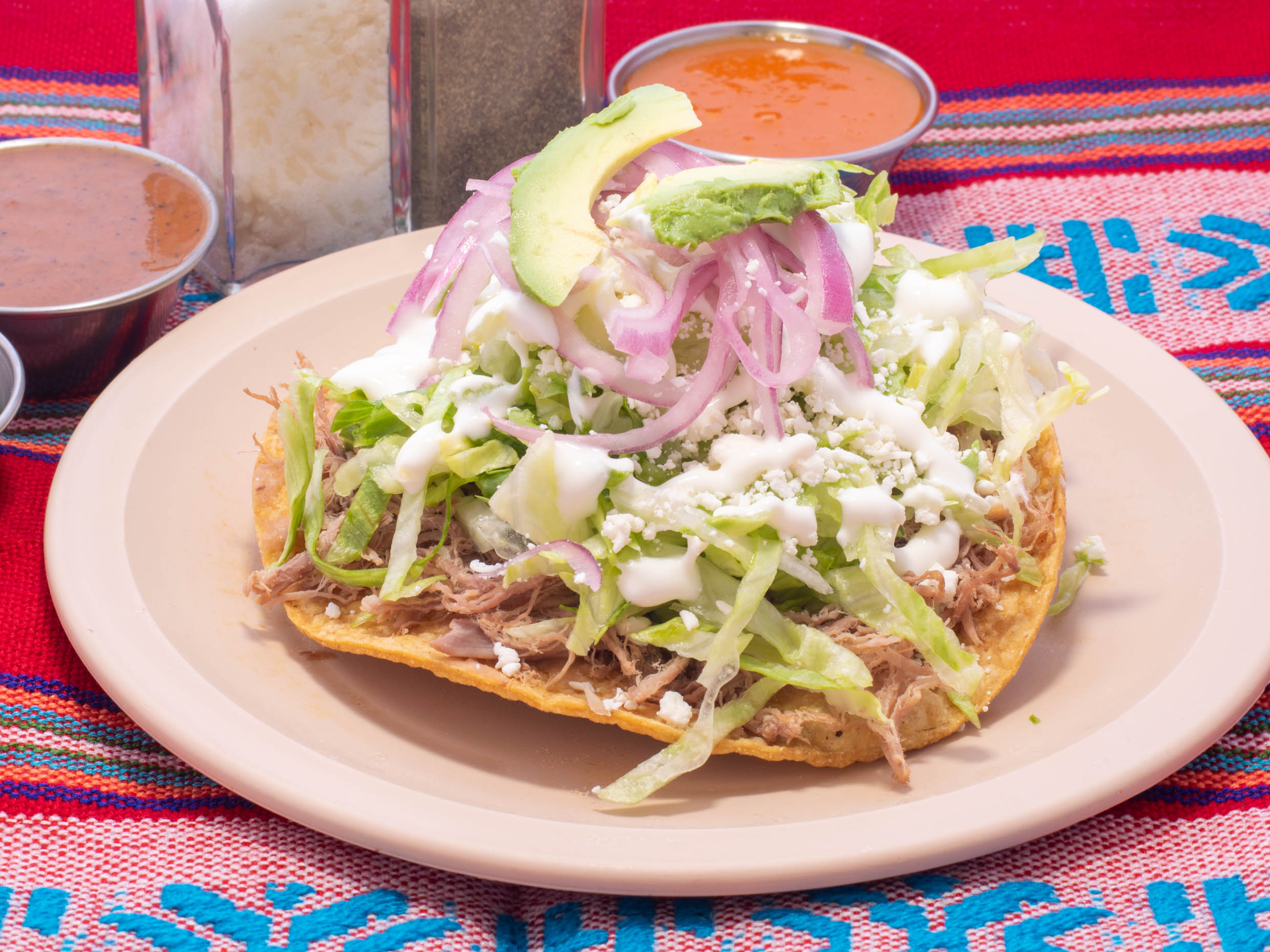 Enchiada Roja, con queso, crema, Lechuga, tomate, cebolla y aguacate.