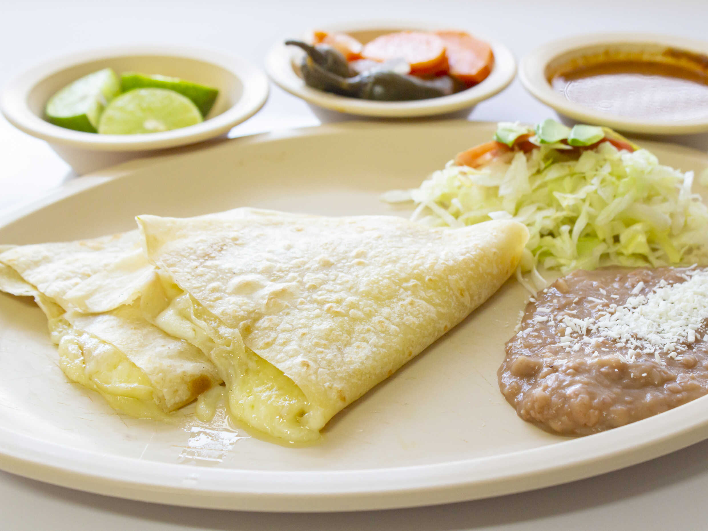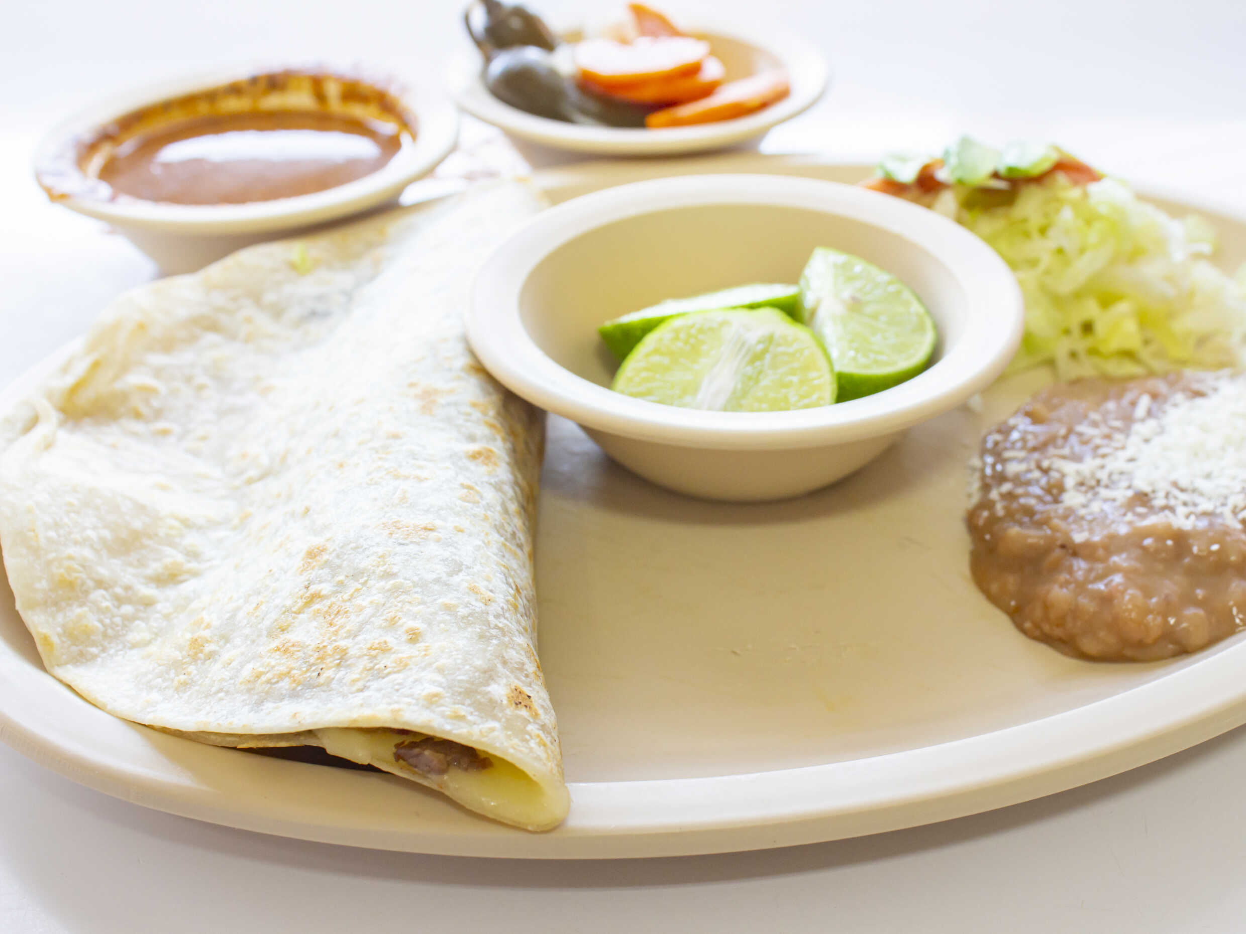 Quesadilla de tortilla de harina con carne,Acompañando de lechuga y frijol.