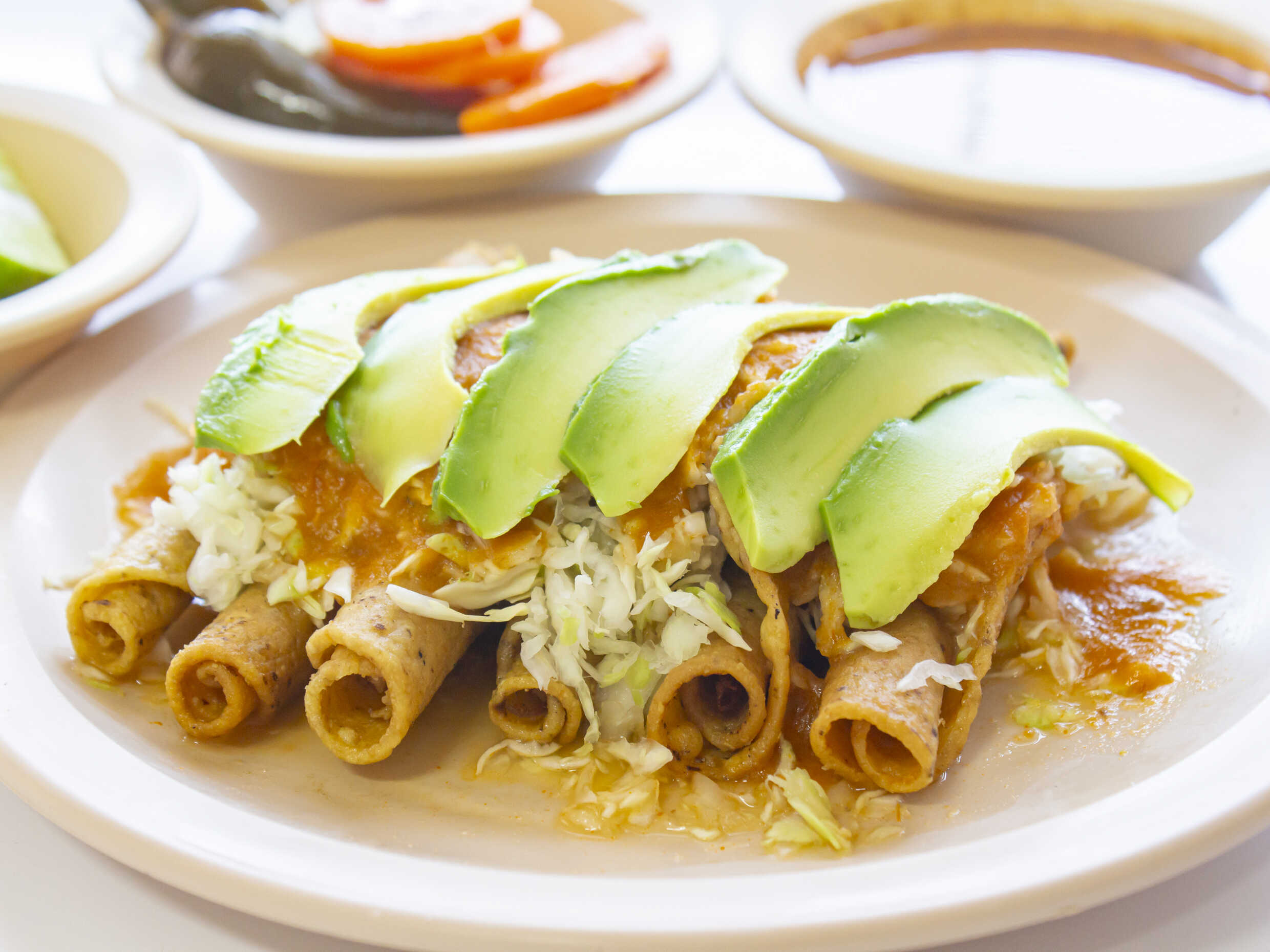 Docena de flautas de harina de maiz con repollo o luchuga, con o sin aguacate y salsa de tomate