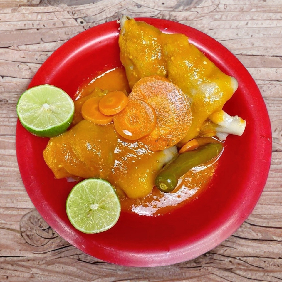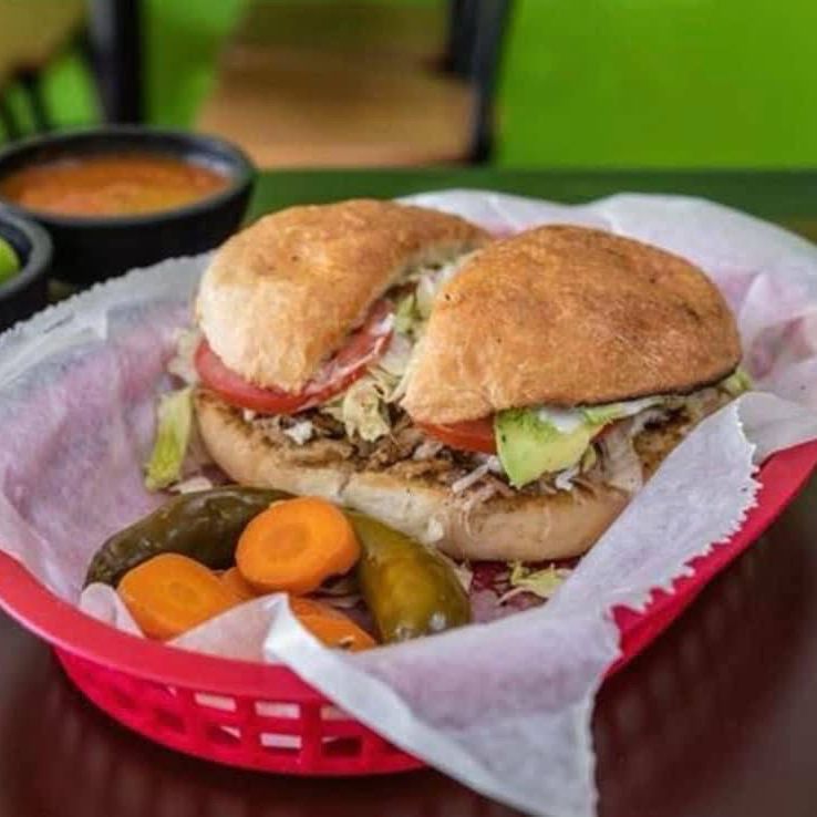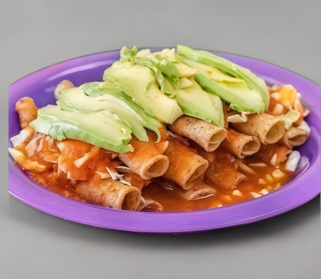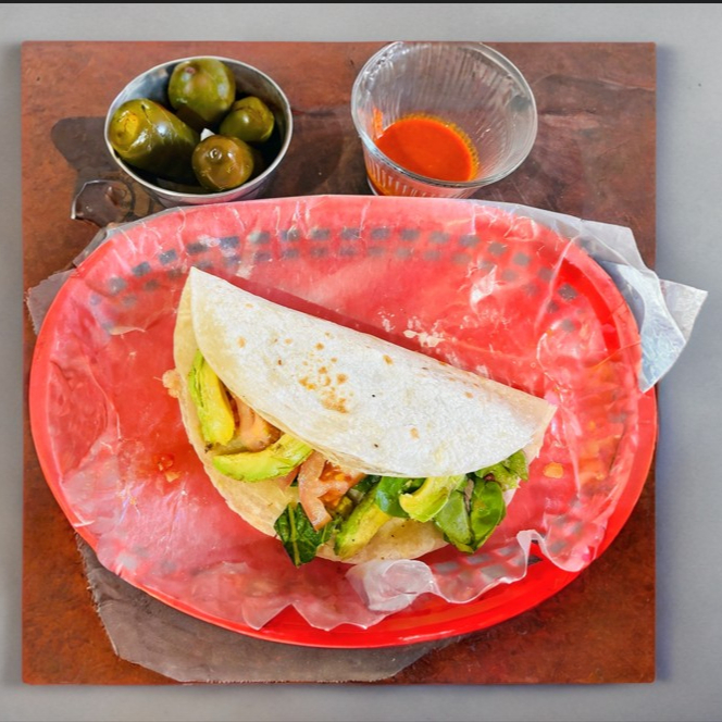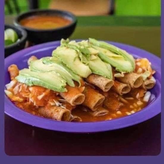 Tortilla,carne encima lleva repollo y aguacate,bañada con salsa de tomate