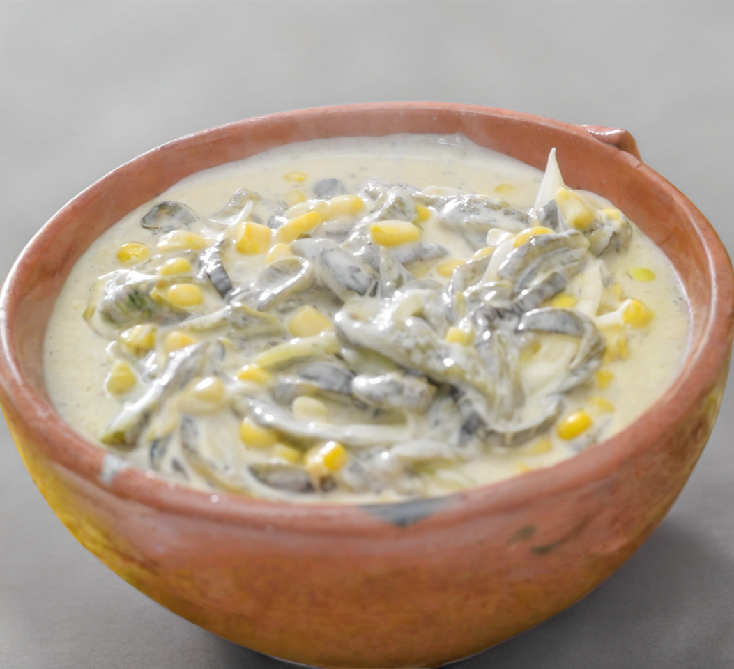 Rajasde chile poblano con crema y queso mozarrella con elote en una tortilla de harina o maiz con una embarrita de frijol