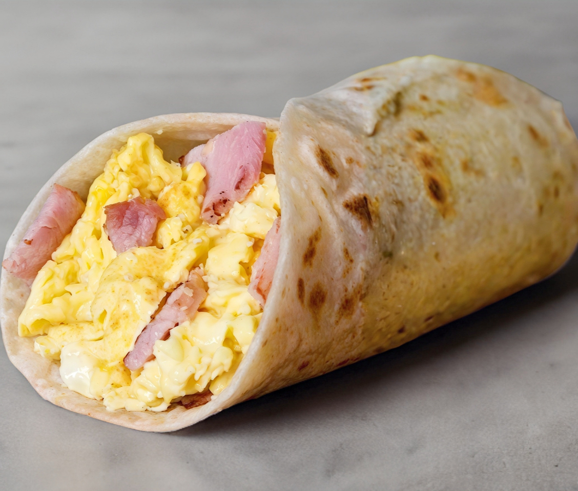 Huevo con jamón fresco de diario envuelto en una tortilla de harina o maiz con una embarradita de frijol