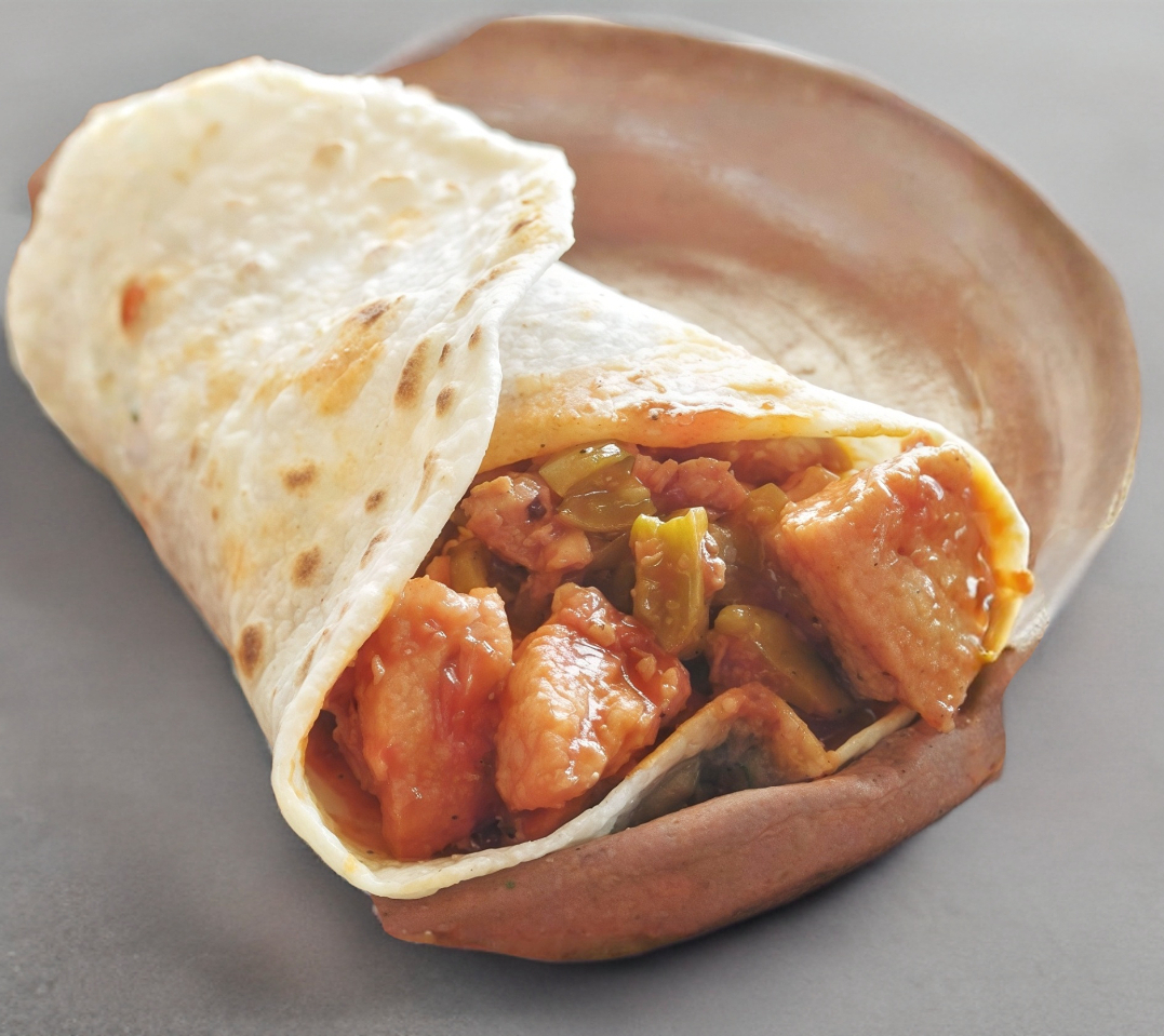100 % Bisteck en Salsa roja no picosa adobadita en una tortilla de harina o maiz con una embarradita de frijol