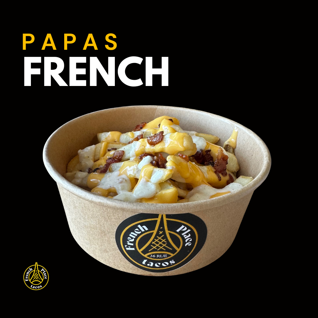 Papas a la francesa cubiertas con salsa cheddar, salsa french y topping de tocino.