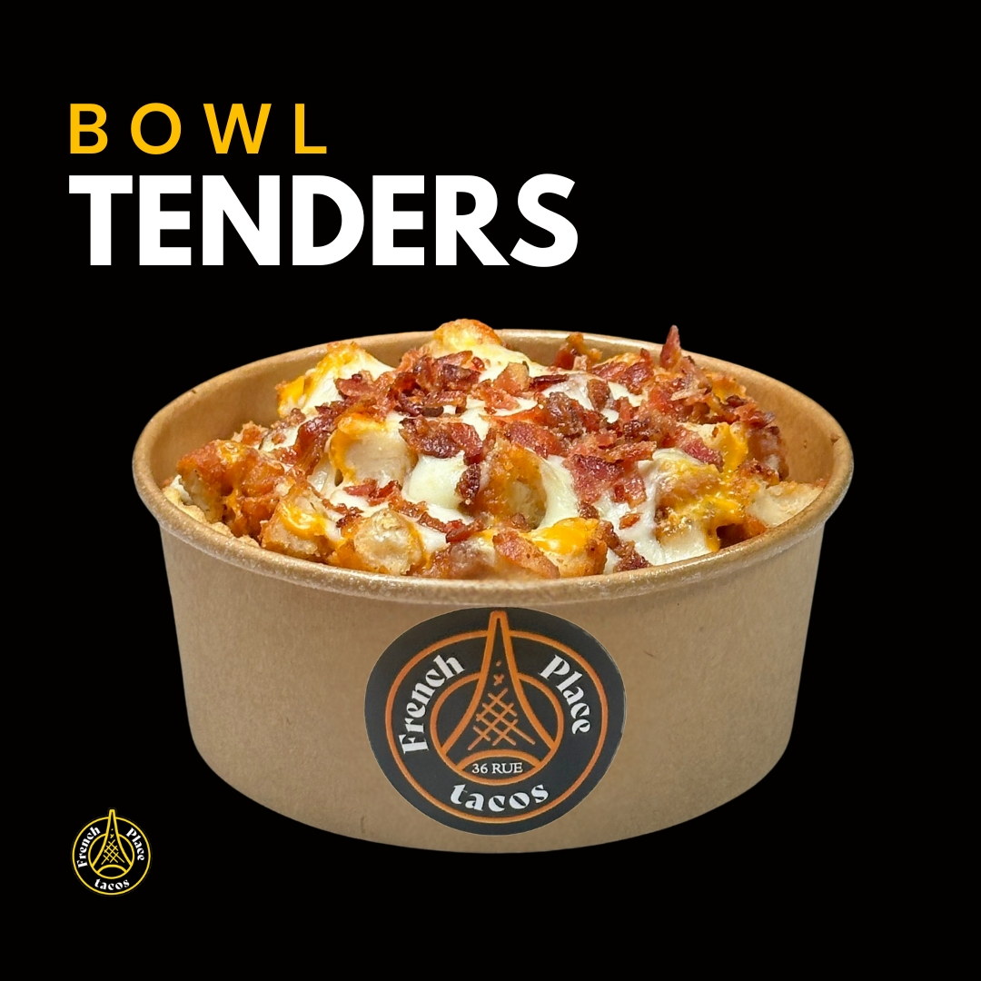 Tenders de pechuga de pollo, papas fritas, queso cheddar blanco, salsa harissa y salsa french.